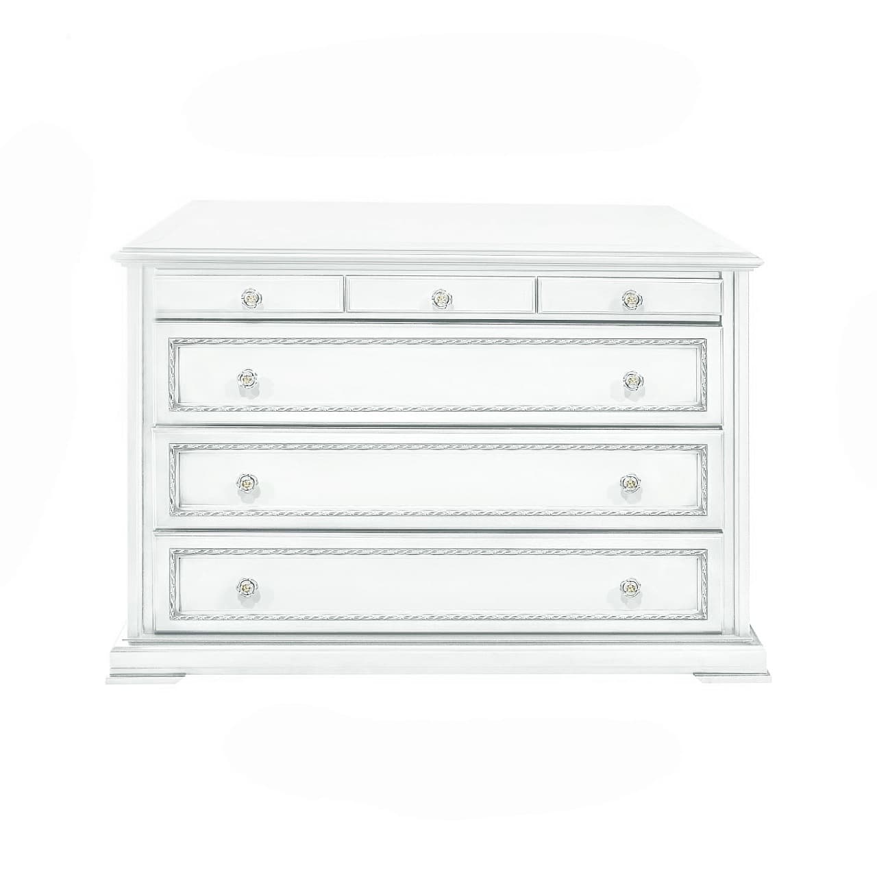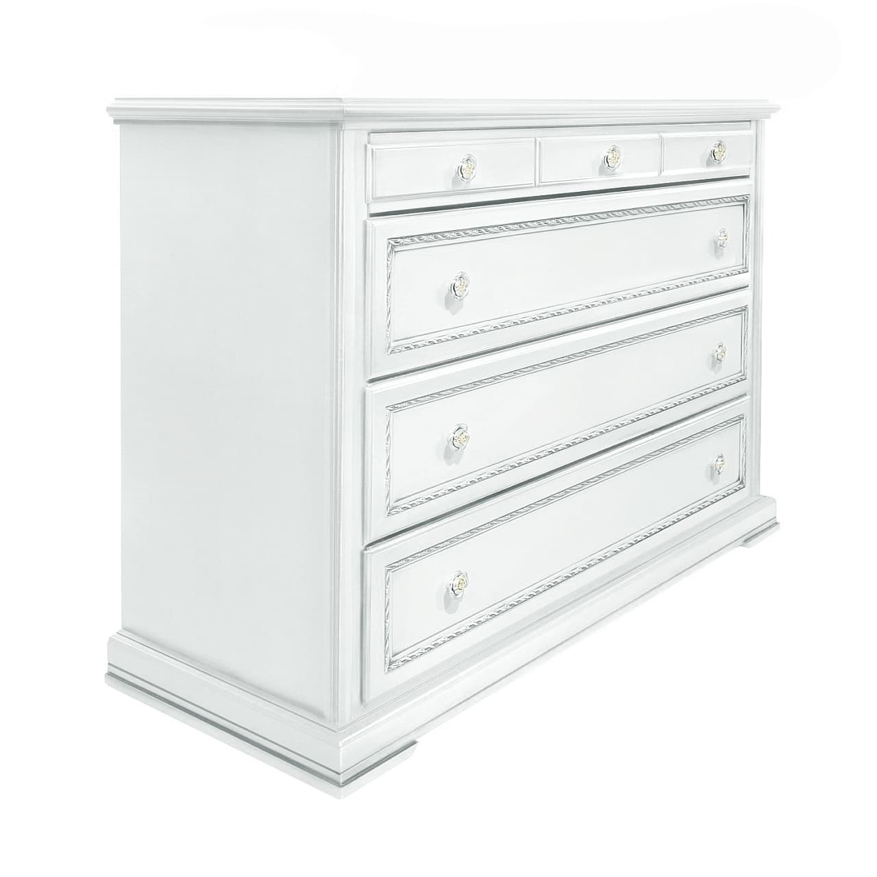 Комод выполнен в белом оттенке из шпонированного МДФ с элементами из массива дерева и декорирован серебряной патиной, которая подчеркивает акцентные детали изделия.