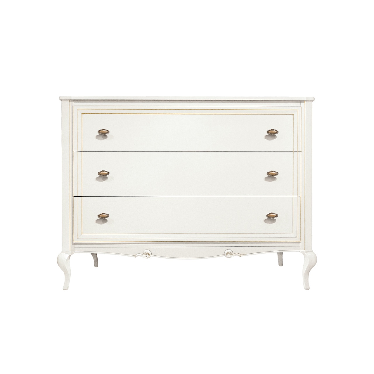 Комод для белья и одежды из коллекции Портофино от фабрики Тимбер оборудован тремя вместительными ящиками, которые оснащены системой плавного закрывания.