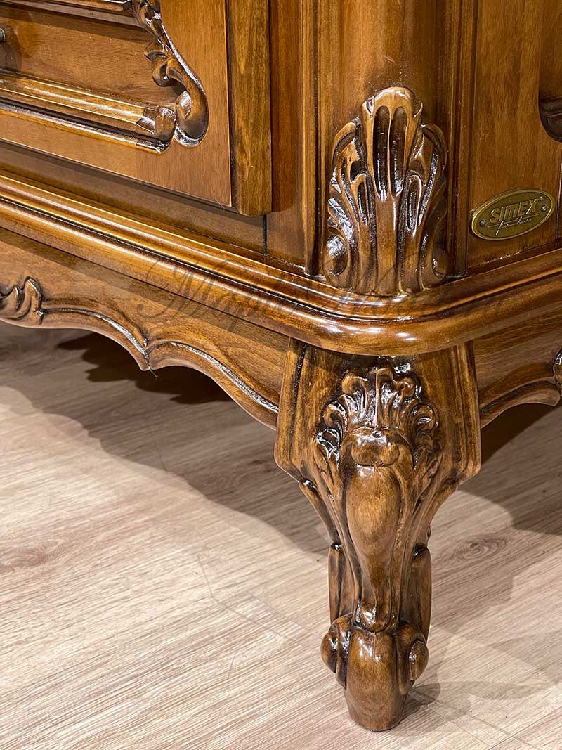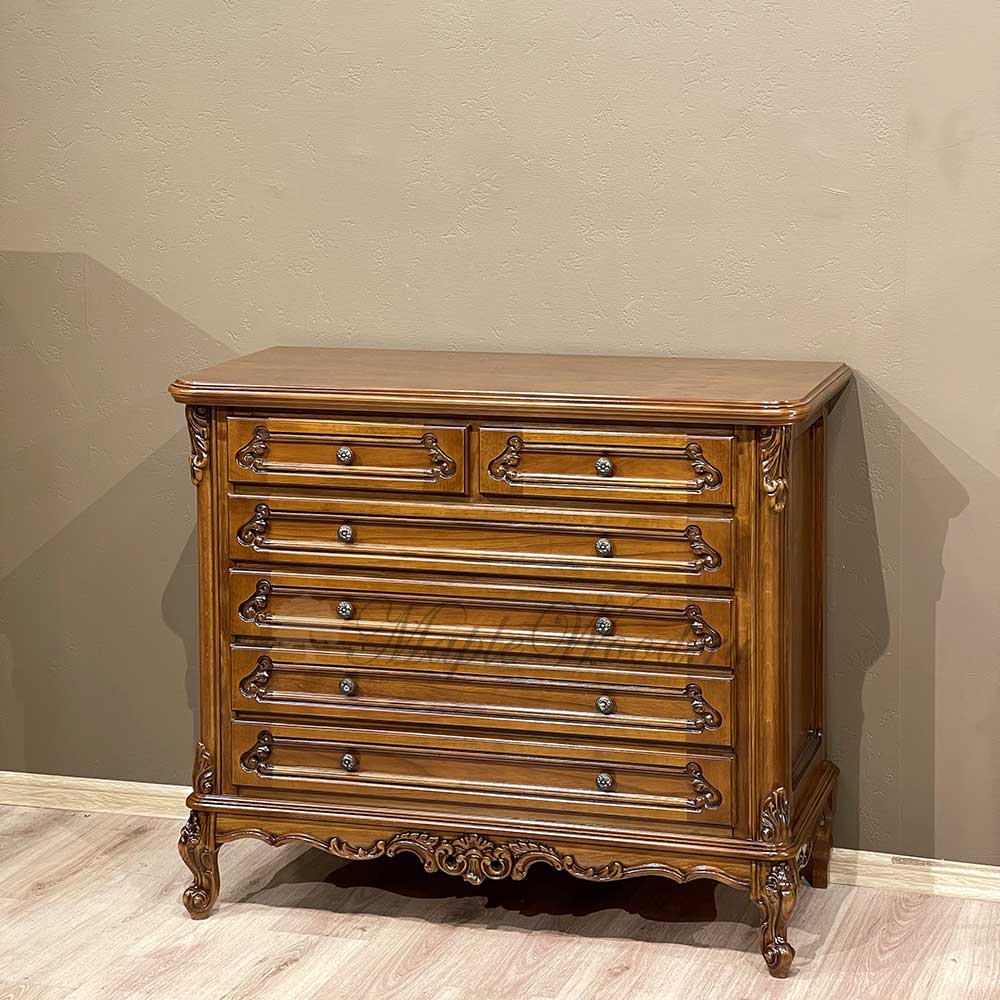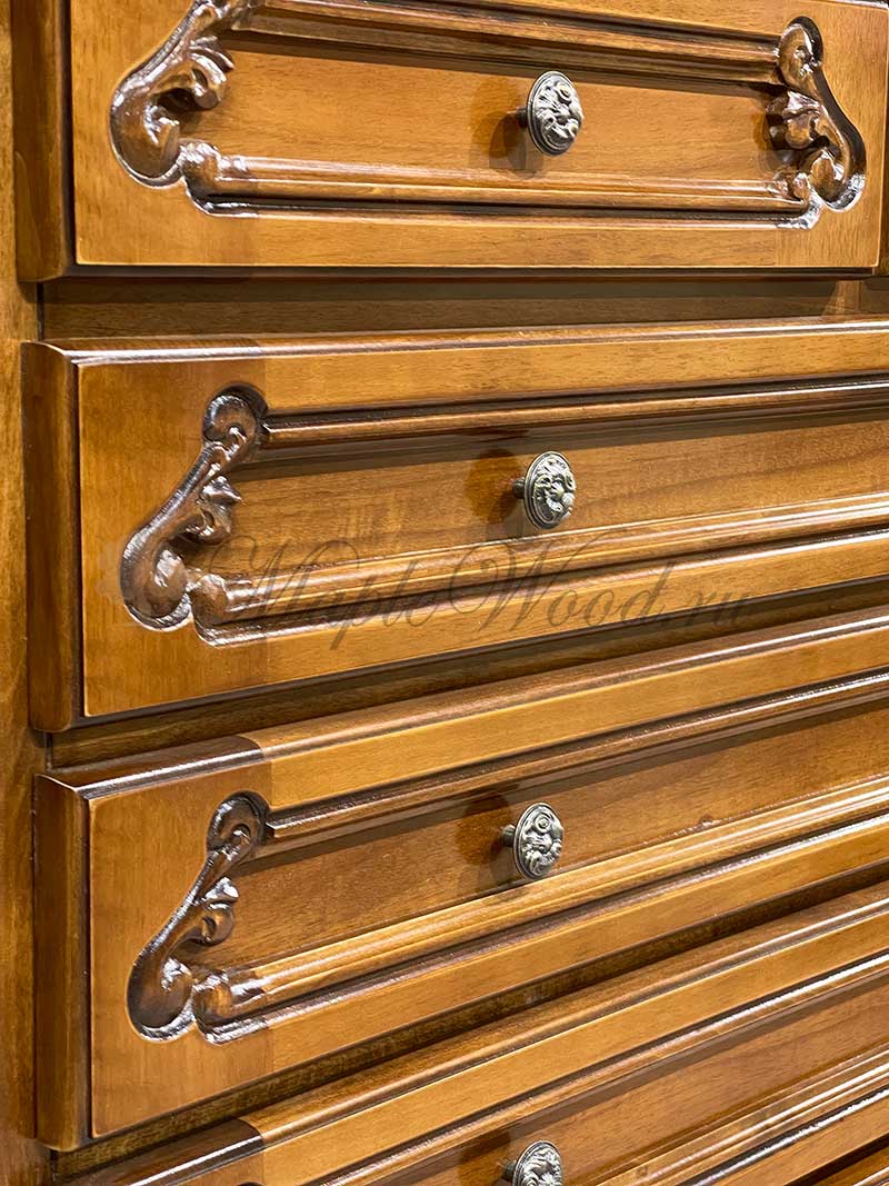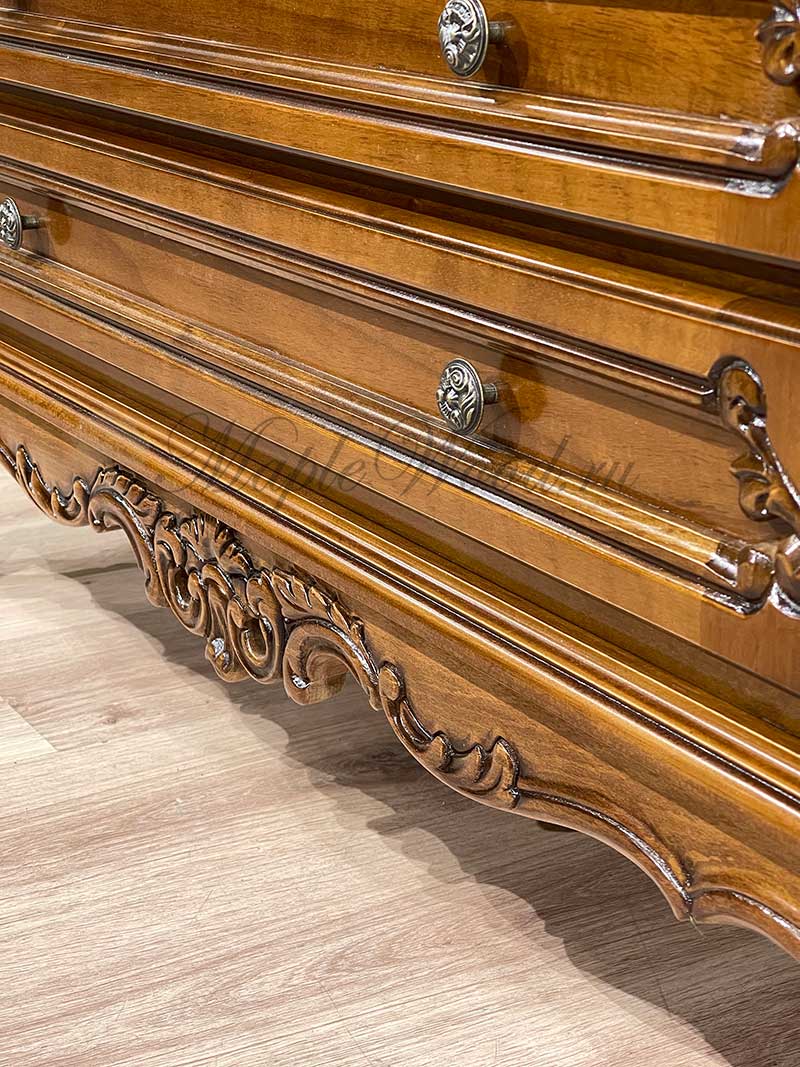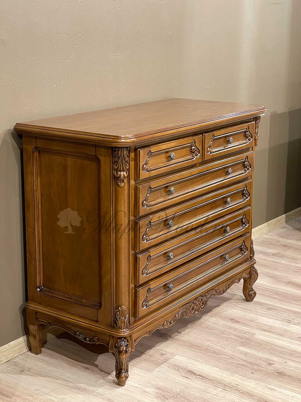 Бельевой комод из коллекции Роял от фабрики Simex выполнен по всем канонам классического стиля из натурального дерева в отделке орех и декорирован искусной резьбой ручной работы.