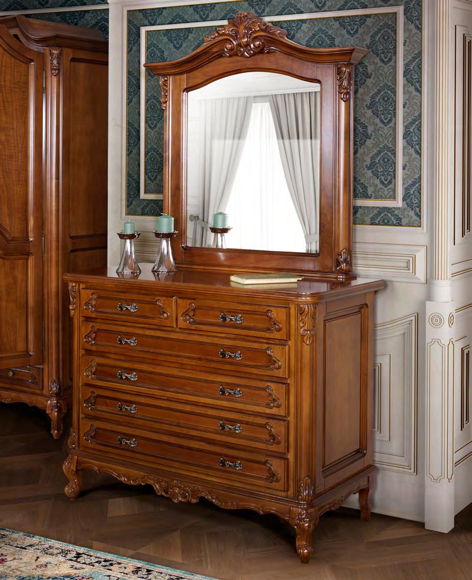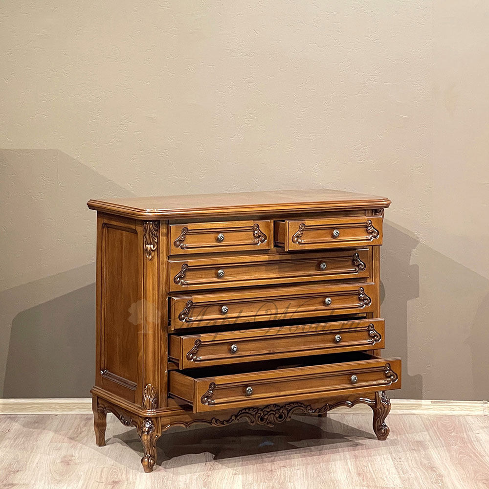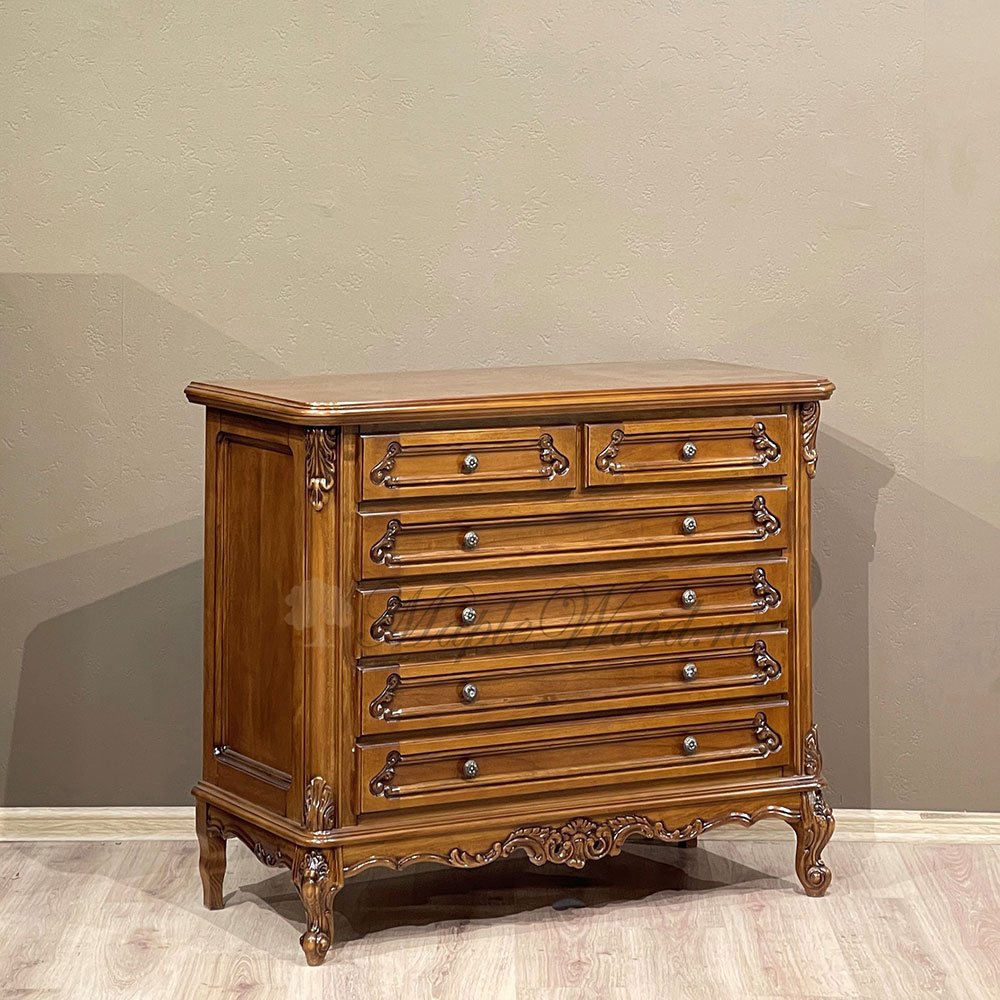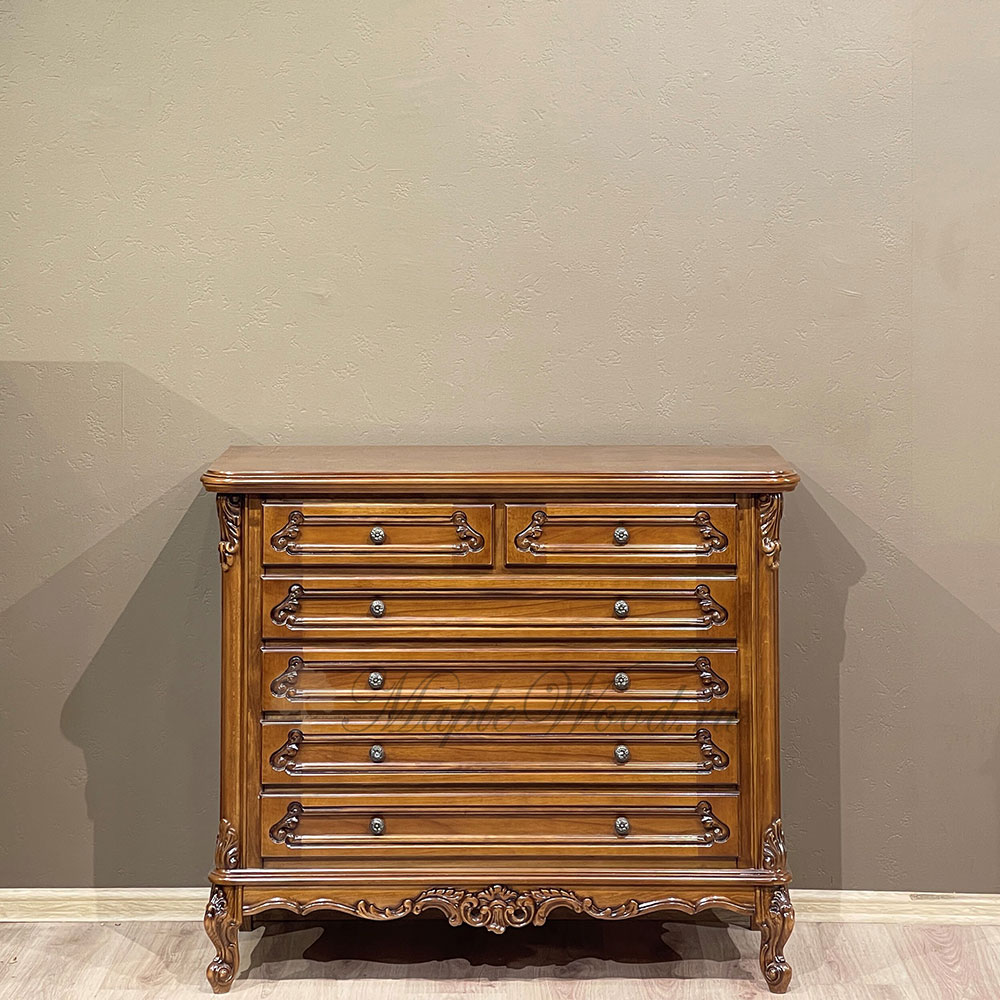 Бельевой комод из коллекции Роял от фабрики Simex выполнен по всем канонам классического стиля из натурального дерева в отделке орех и декорирован искусной резьбой ручной работы.