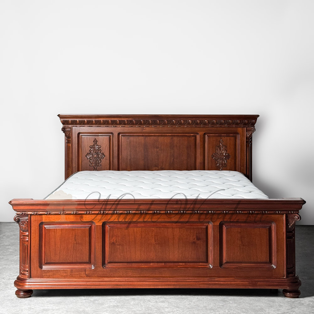 Кровать с прямоугольным изголовьем из коллекции Венеция Люкс от фабрики Simex выполнена из массива дерева в отделке орех с красным оттенком и украшена резными элементами и декоративными пилястрами, которые подчеркивают классический дизайн изделий.