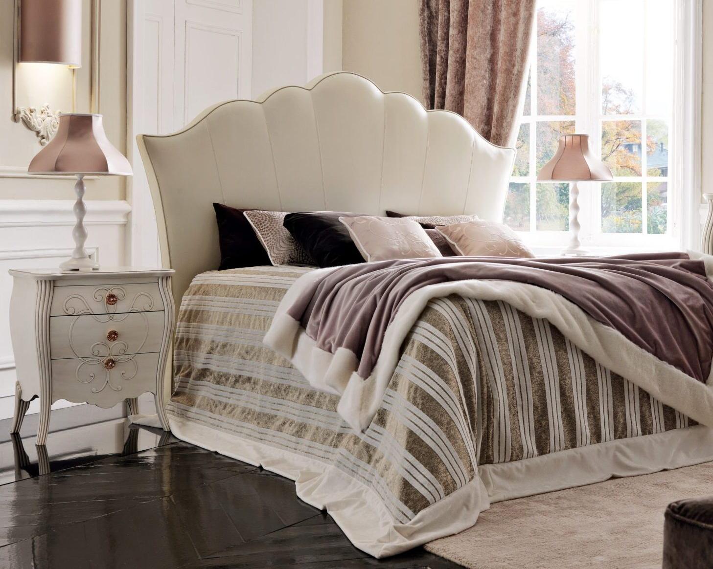 Двуспальная кровать из коллекции Франческо имеет фигурные ножки с лаконичным резным декором и эффектное фигурное изголовье.