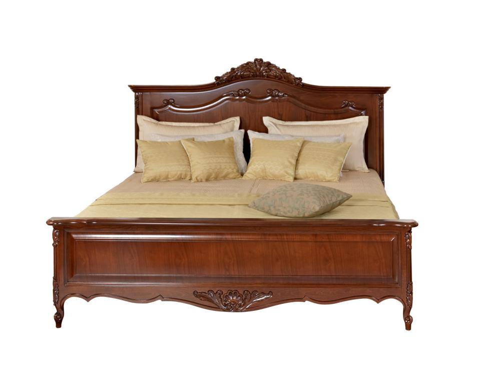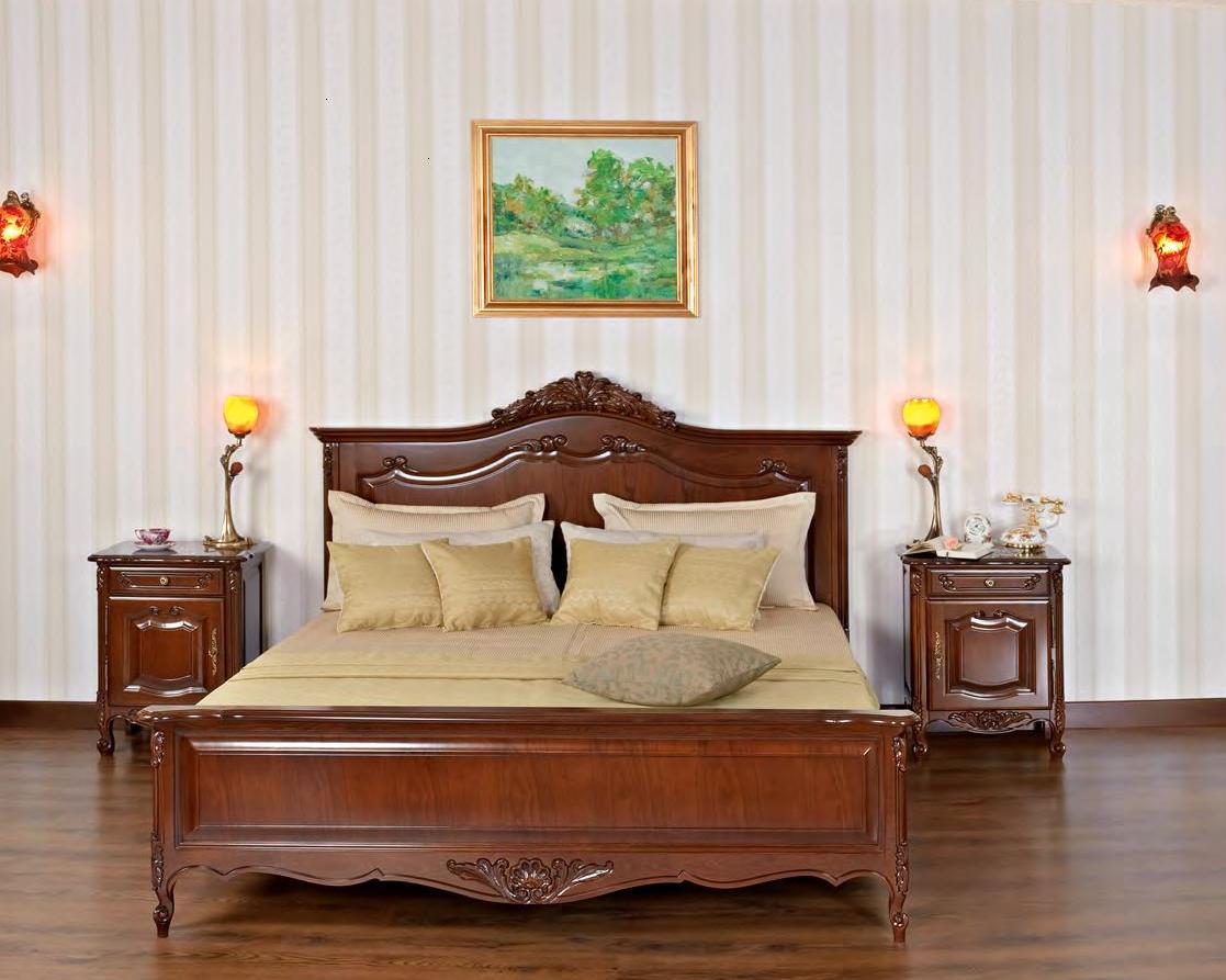 Двуспальная кровать из коллекции Могадор от фабрики Мобекс | Mobex выполнена из массива дерева в отделке орех и декорирована лаконичными резными элементами, которые подчеркивают классический стиль изделия.
