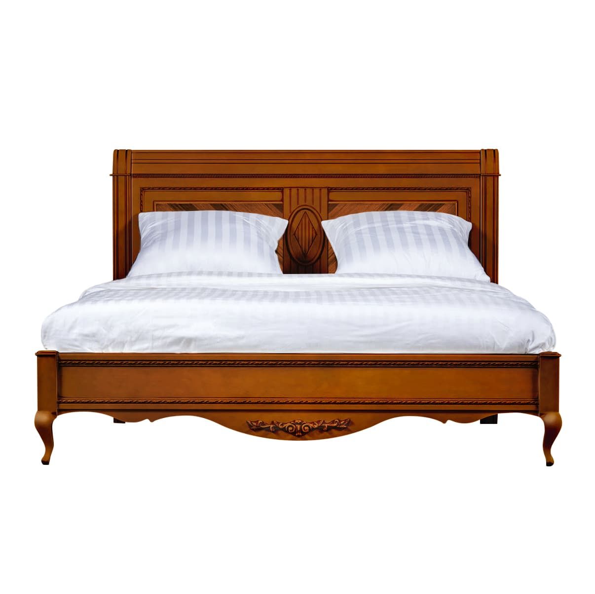 Двуспальная кровать на фигурных ножках из коллекции Неаполь от фабрики Тимбер выполнена в классическом стиле из шпонированного МДФ с элементами из массива дерева и декорирована контрастной патиной, которая подчеркивает акцентные детали изделия.