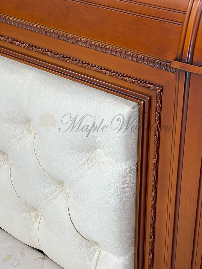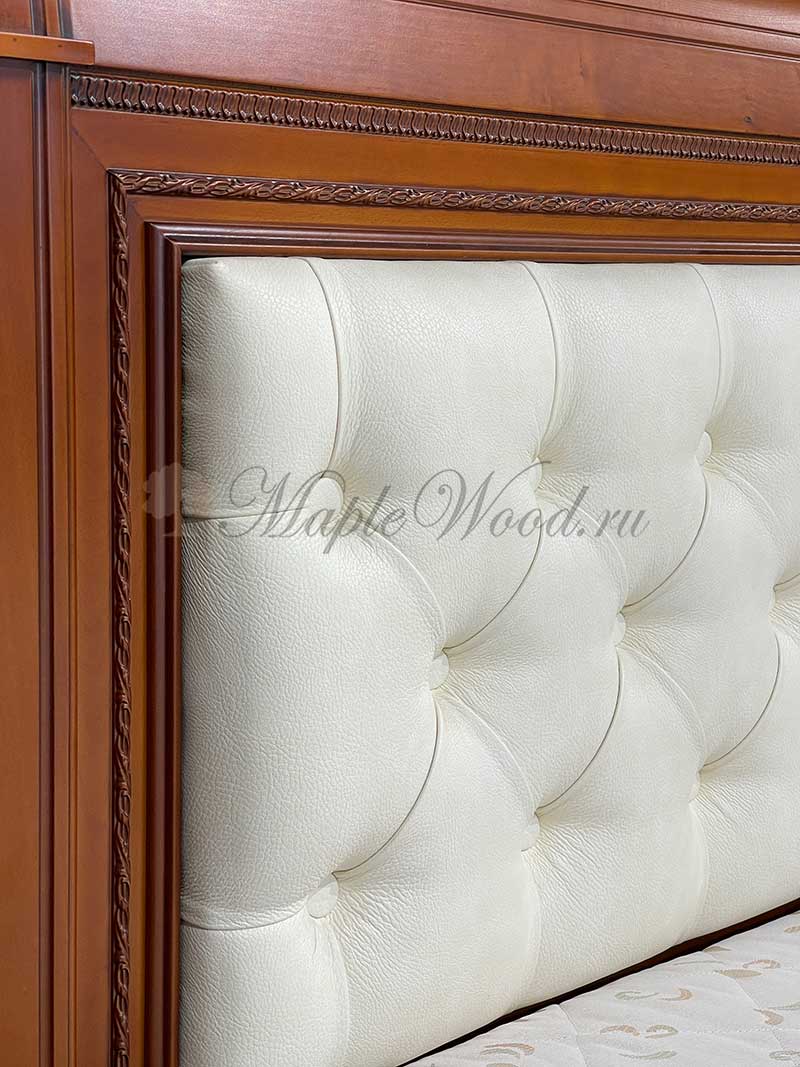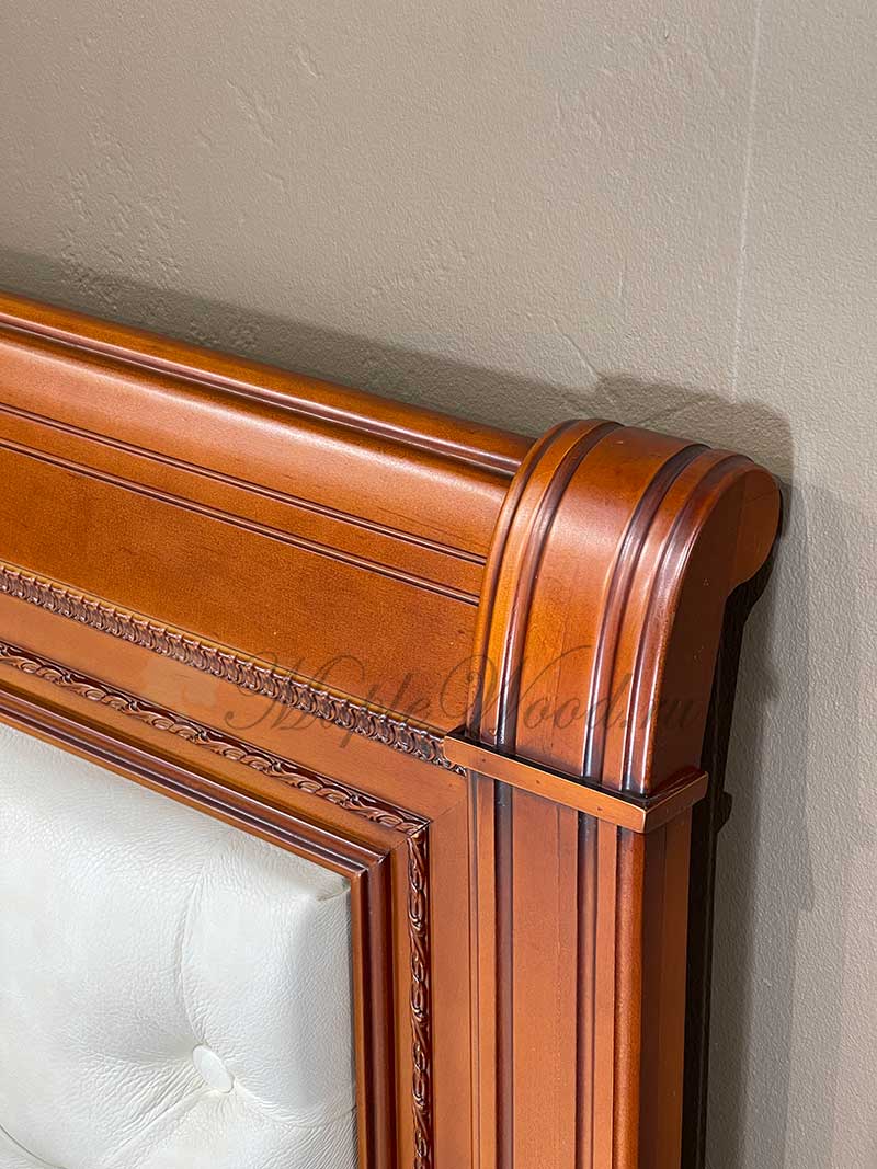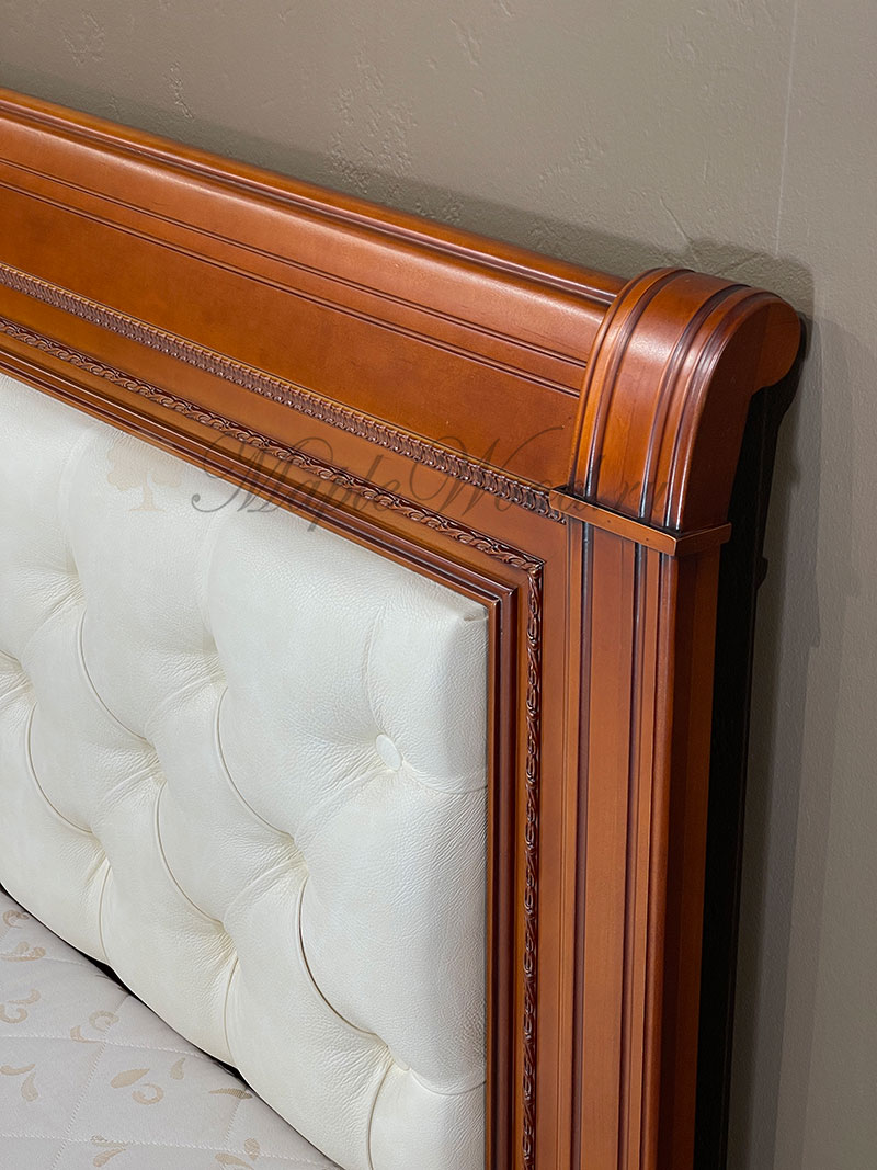 Двуспальная кровать от гарнитура Неаполь от фабрики Тимбер - классическая модель с мягким изголовьем из экокожи, выполненная из шпонированного МДФ с элементами из массива дерева.