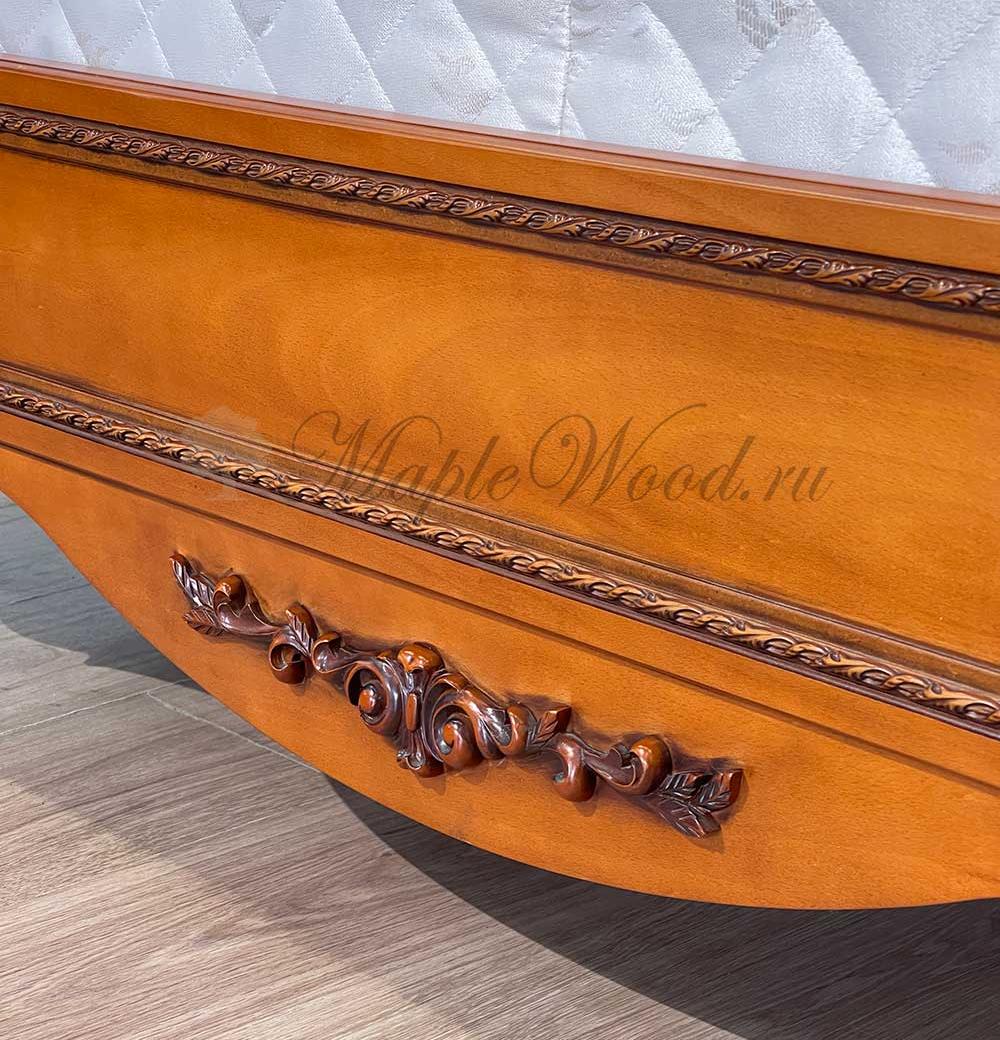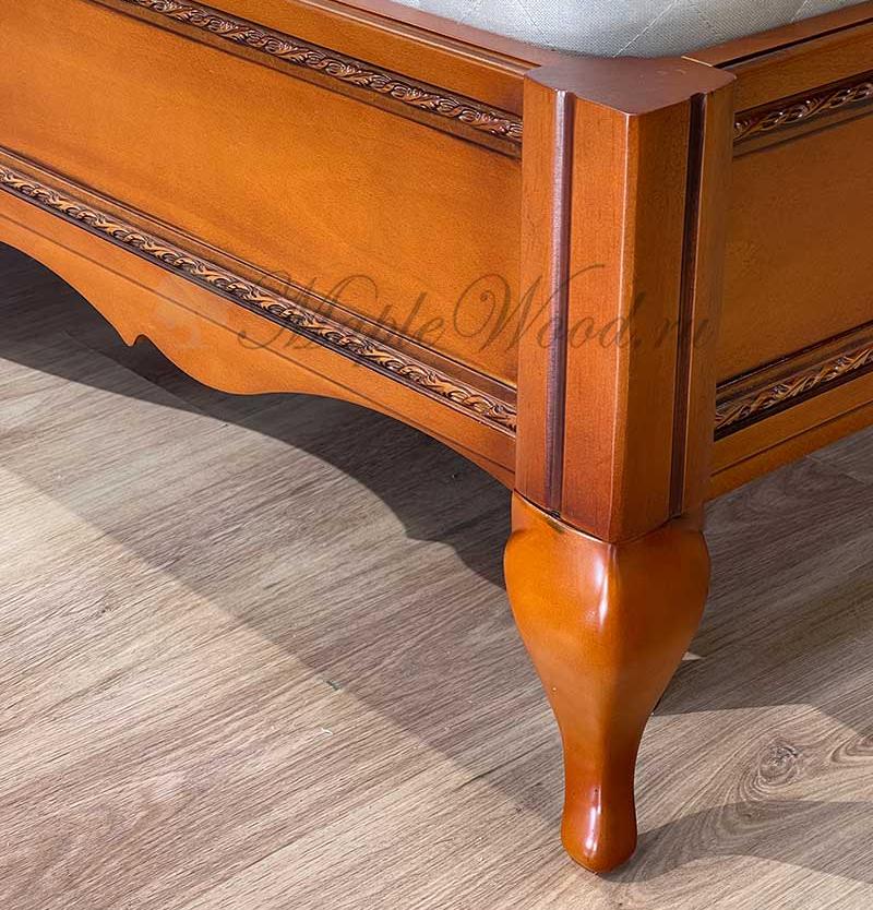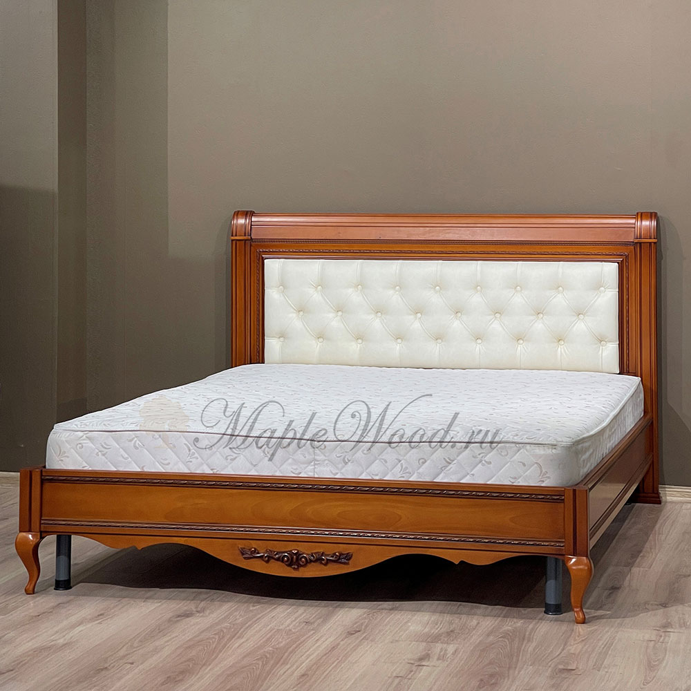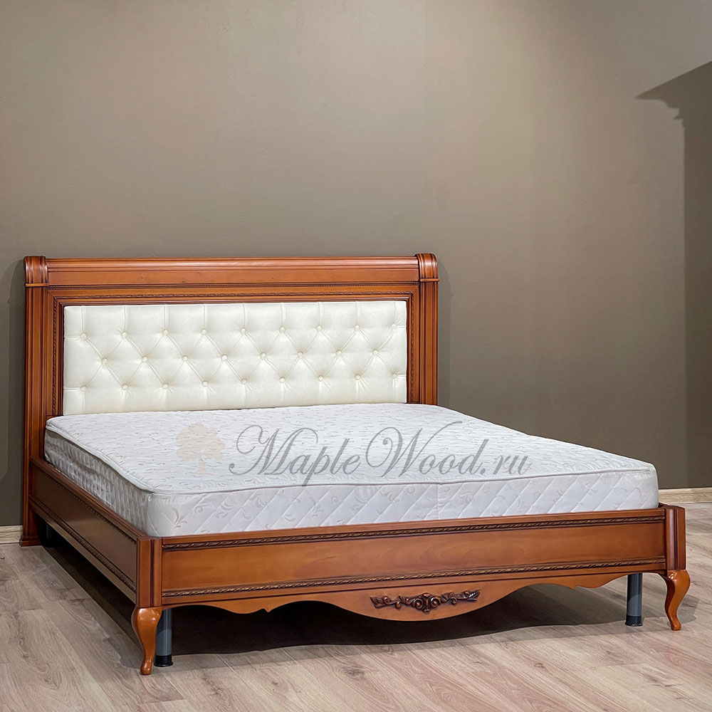 Двуспальная кровать от гарнитура Неаполь от фабрики Тимбер - классическая модель с мягким изголовьем из экокожи, выполненная из шпонированного МДФ с элементами из массива дерева.