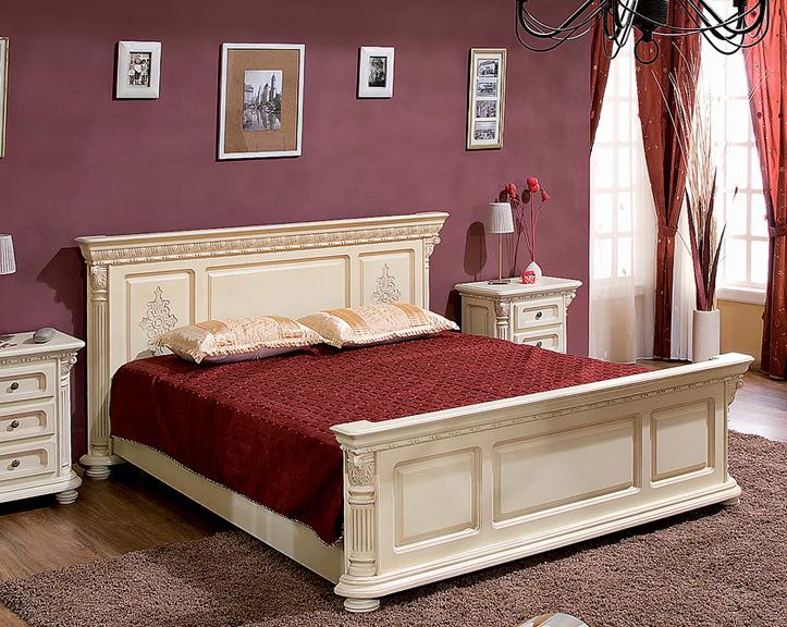 Двуспальная кровать с прямоугольным изголовьем из коллекции Венеция Люкс от фабрики Simex выполнена из массива дерева в светлом оттенке слоновая кость и декорирована контрастной патиной, которая подчеркивает резные элементы изделия.