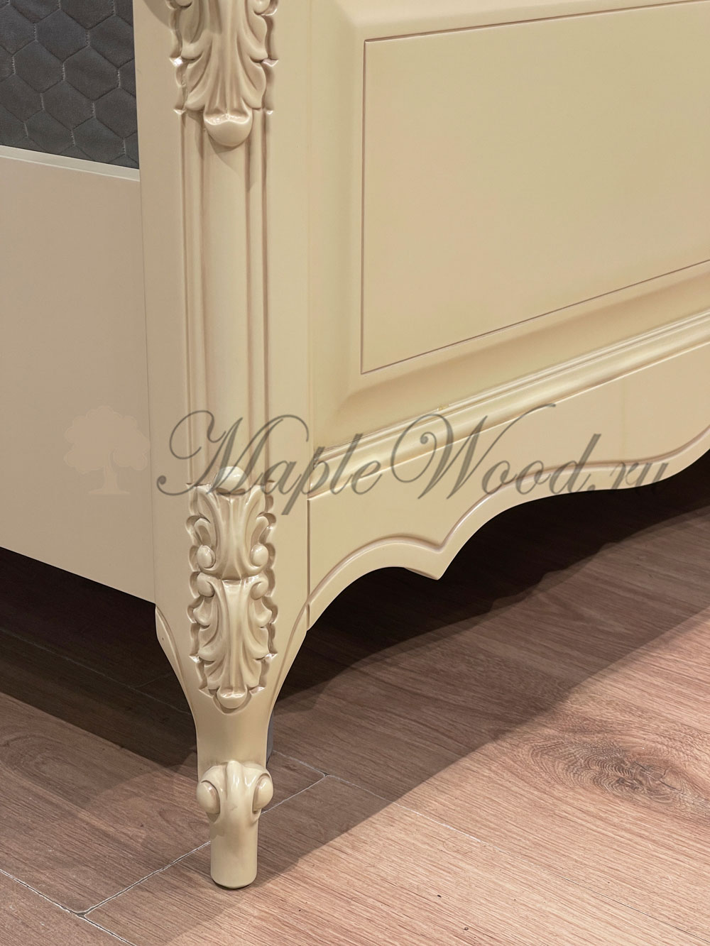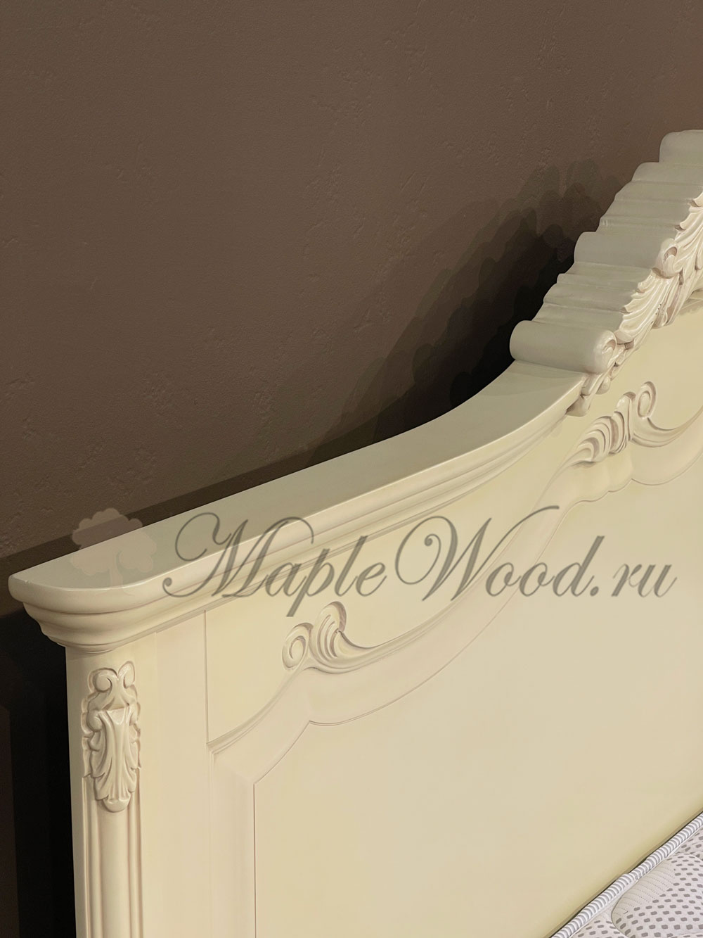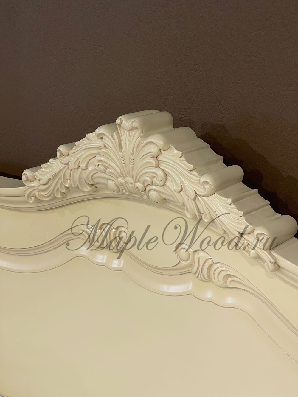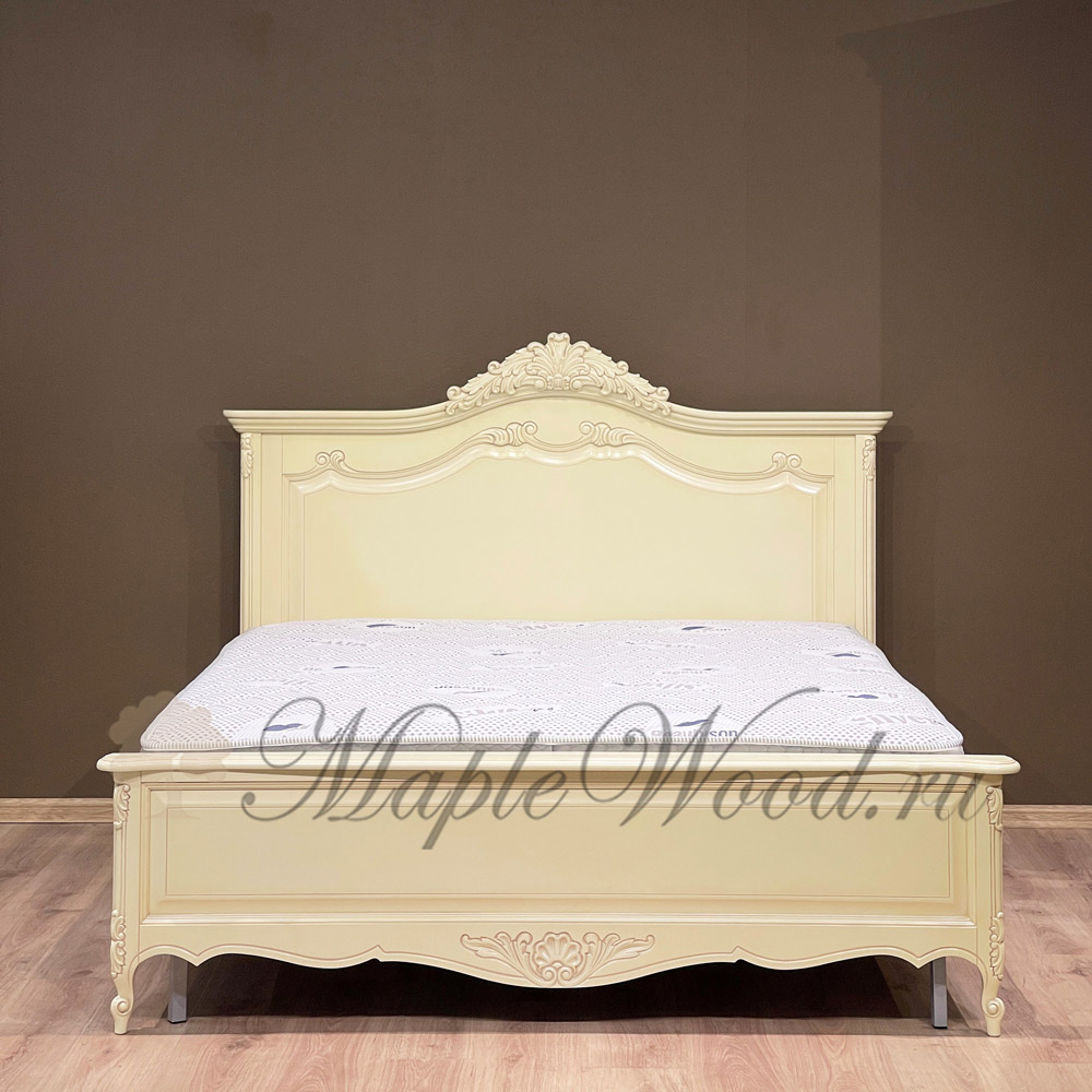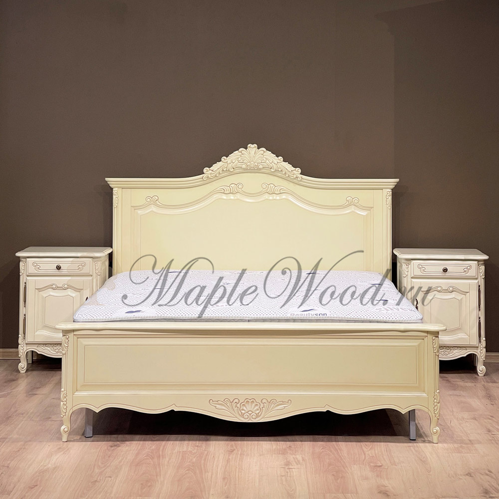 Двуспальная кровать из коллекции Могадор от фабрики Mobex выполнена в классическом стиле из массива дерева в светлом оттенке и декорирована контрастной патиной, которая подчеркивает резные элементы изделия.
