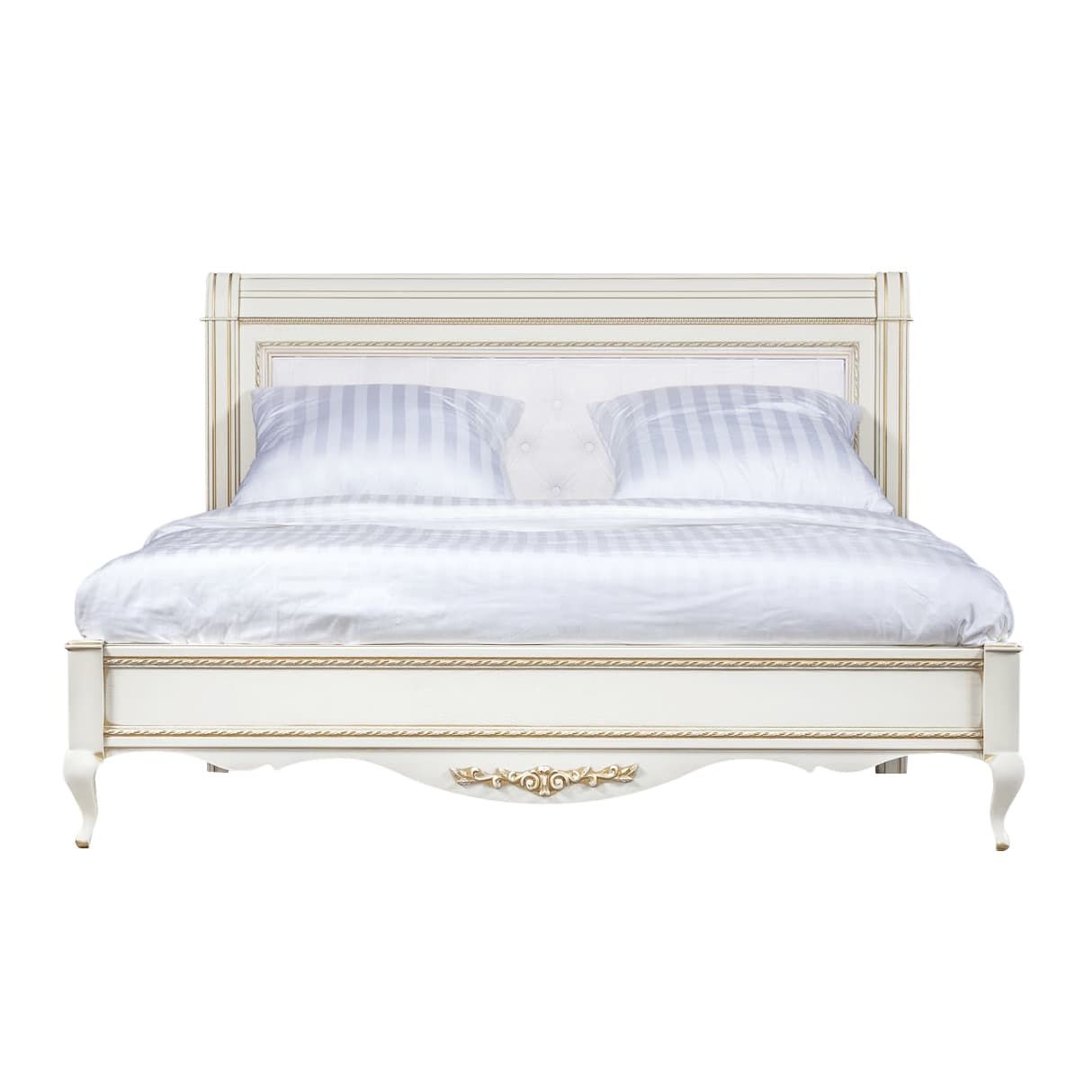 Изделие выполнено из шпонированного МДФ с элементами из массива дерева и декорировано золотой патиной, которая завершает классический дизайн кровати.