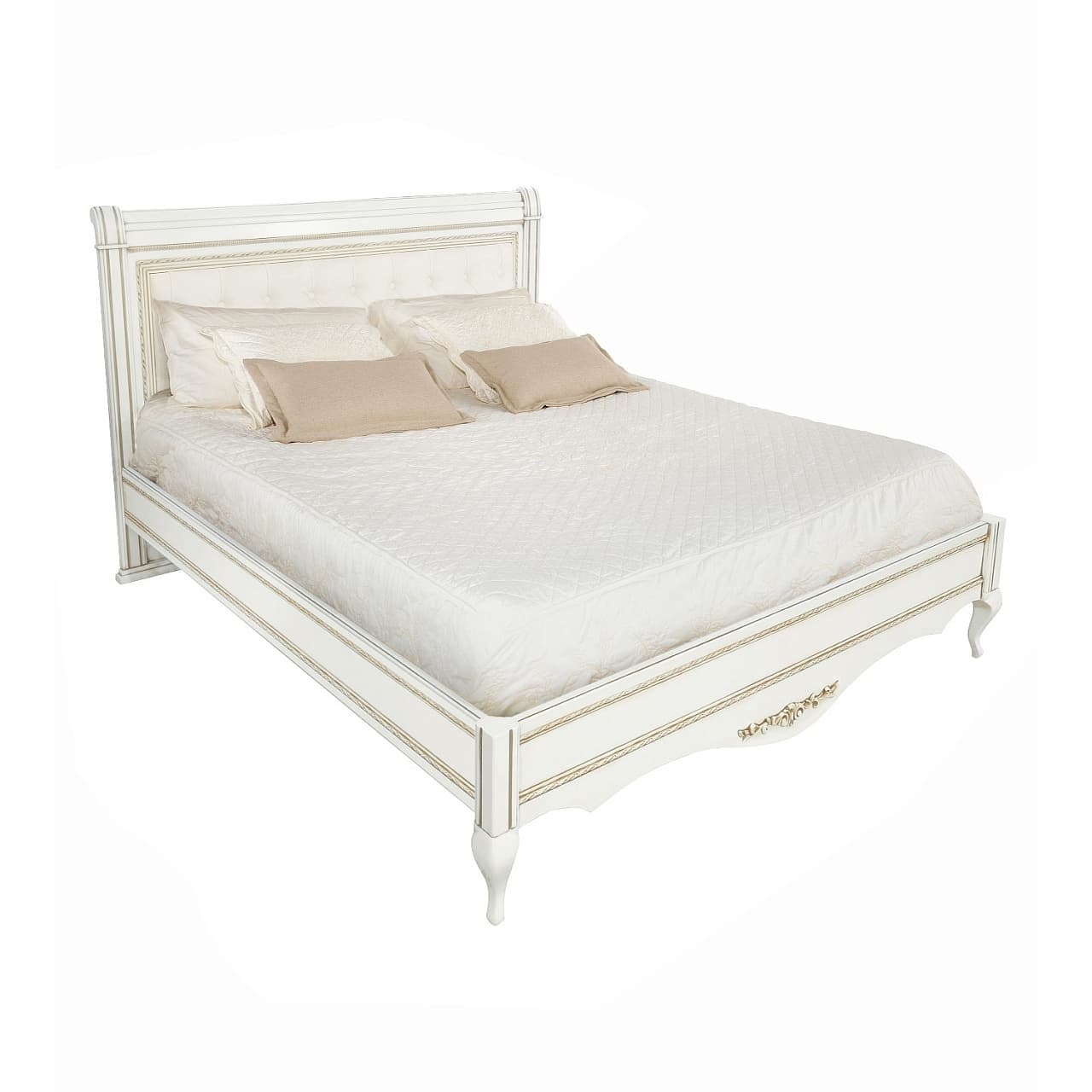 Двуспальная кровать от гарнитура Неаполь от фабрики Тимбер - элегантная модель на фигурных ножках, оборудованная мягким изголовьем из экокожи.