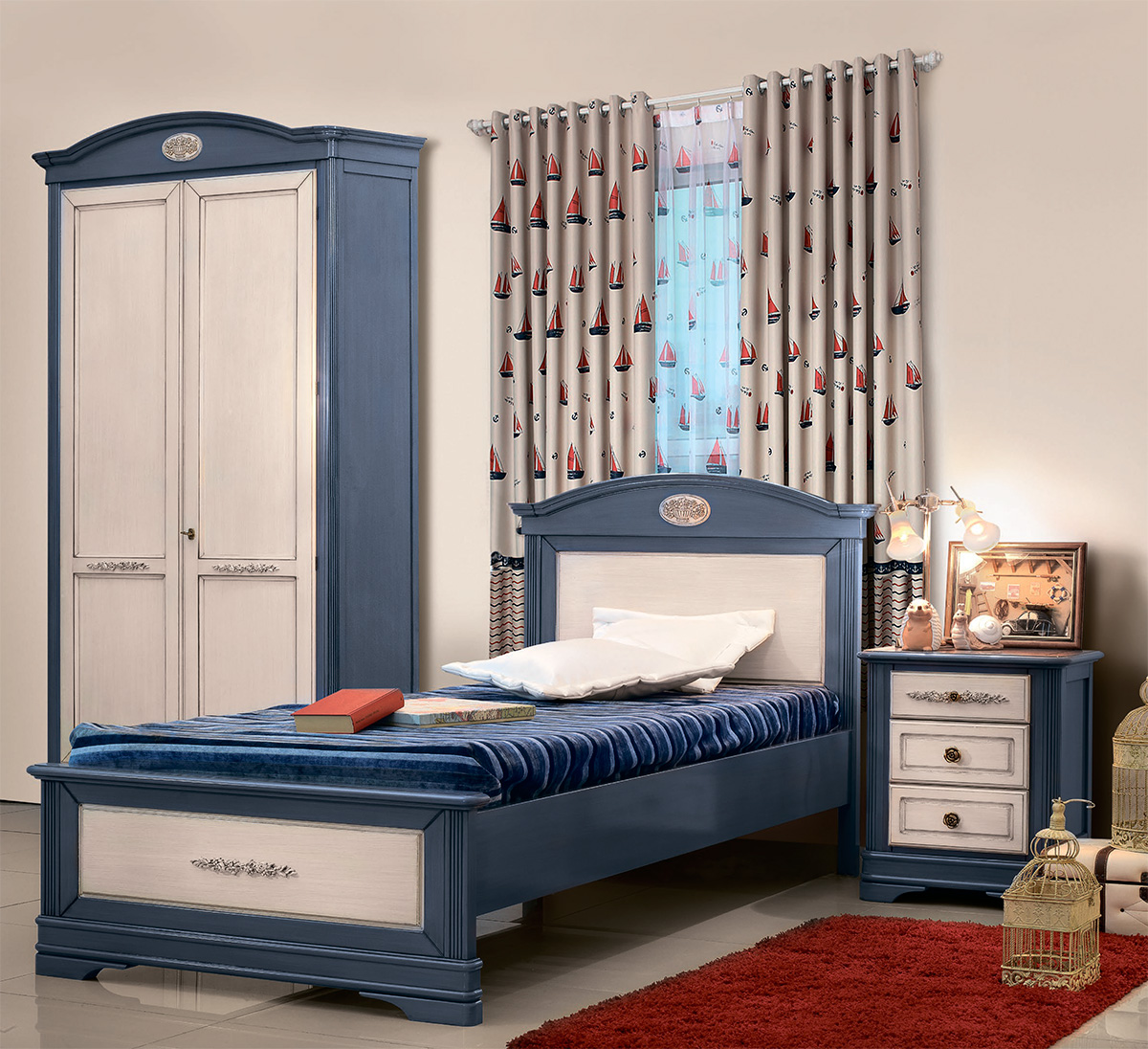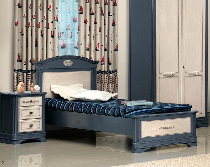Односпальная кровать для детской комнаты из коллекции Артемида от фабрики Monte Cristo Mobili выполнена в стиле неоклассика из натурального массива дерева в оригинальном цветовом сочетании из 2-х оттенков: синий и кремовый.