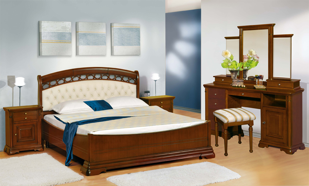 Двуспальная кровать с комбинированным изголовьем из коллекции Элеганс от фабрики Мобекс | Mobex выполнена из массива бука в темной отделке орех, сочетая в себе сдержанные формы и строгий стиль классики.
