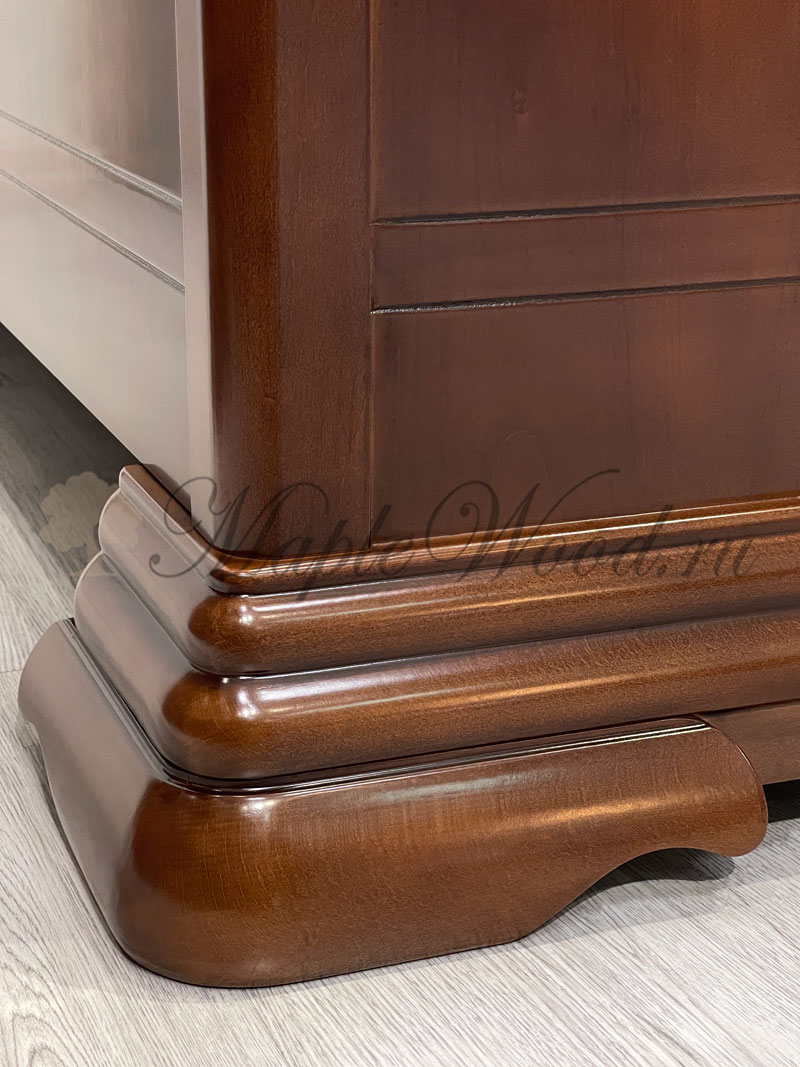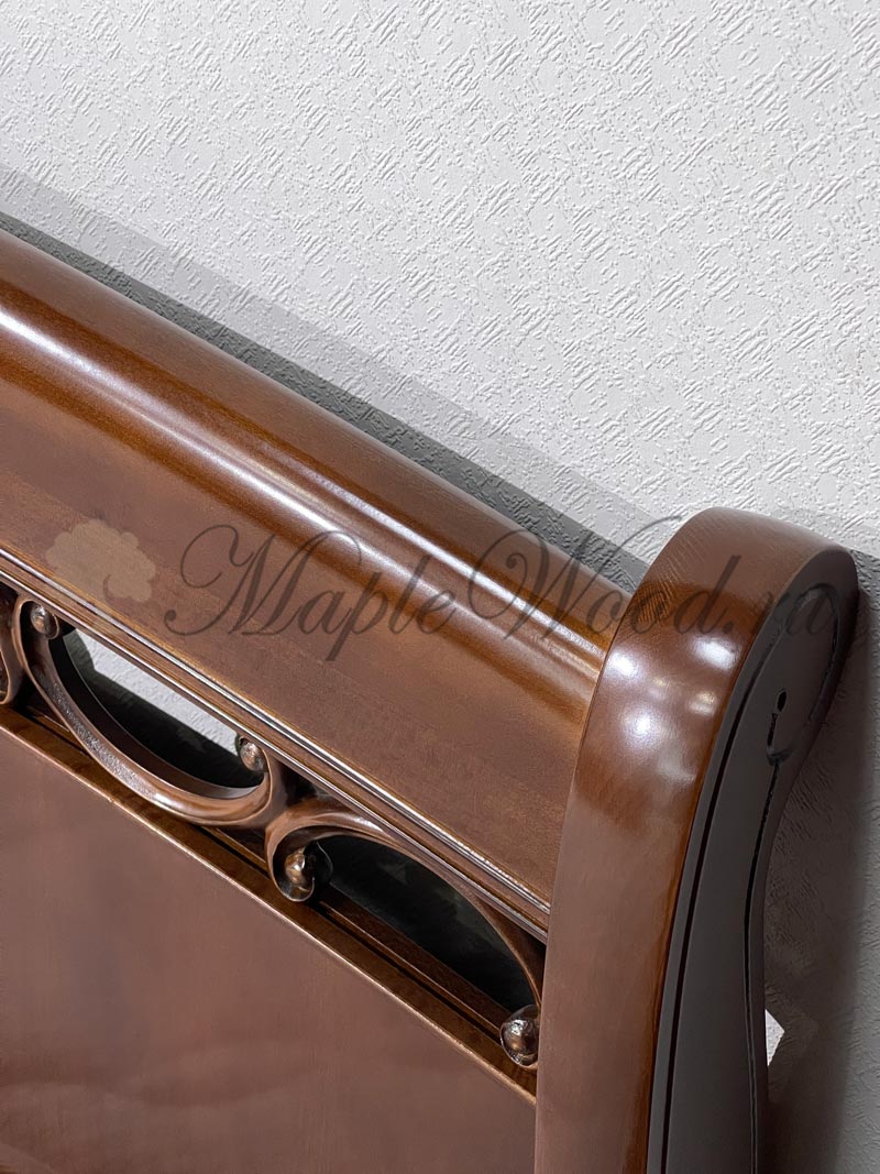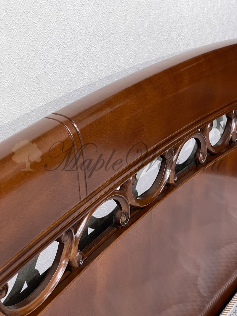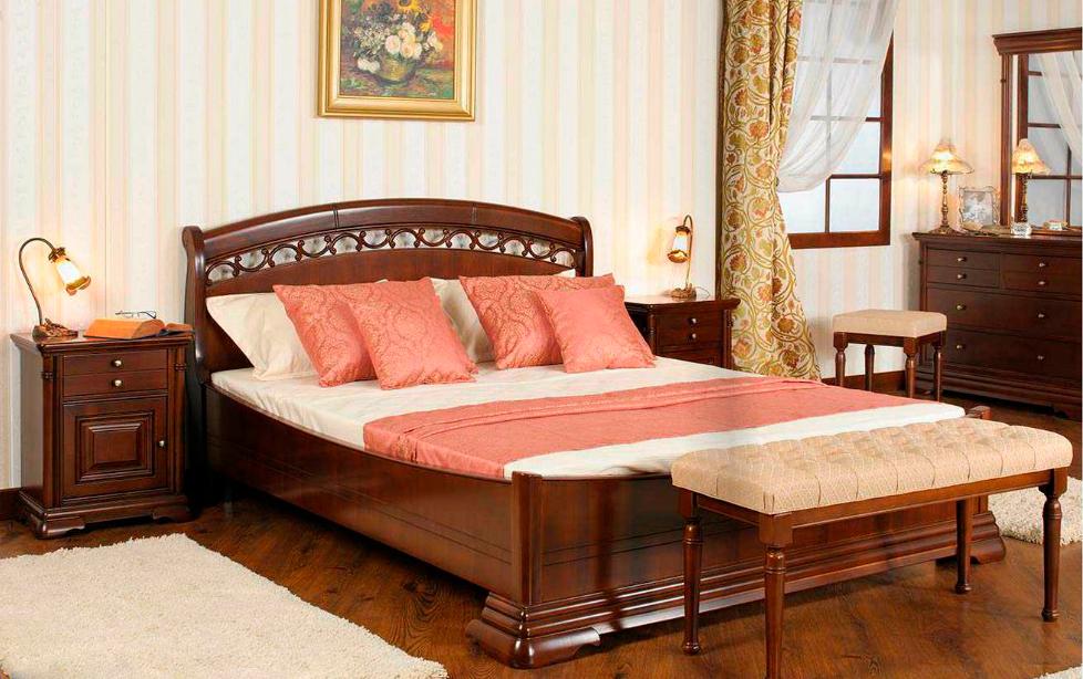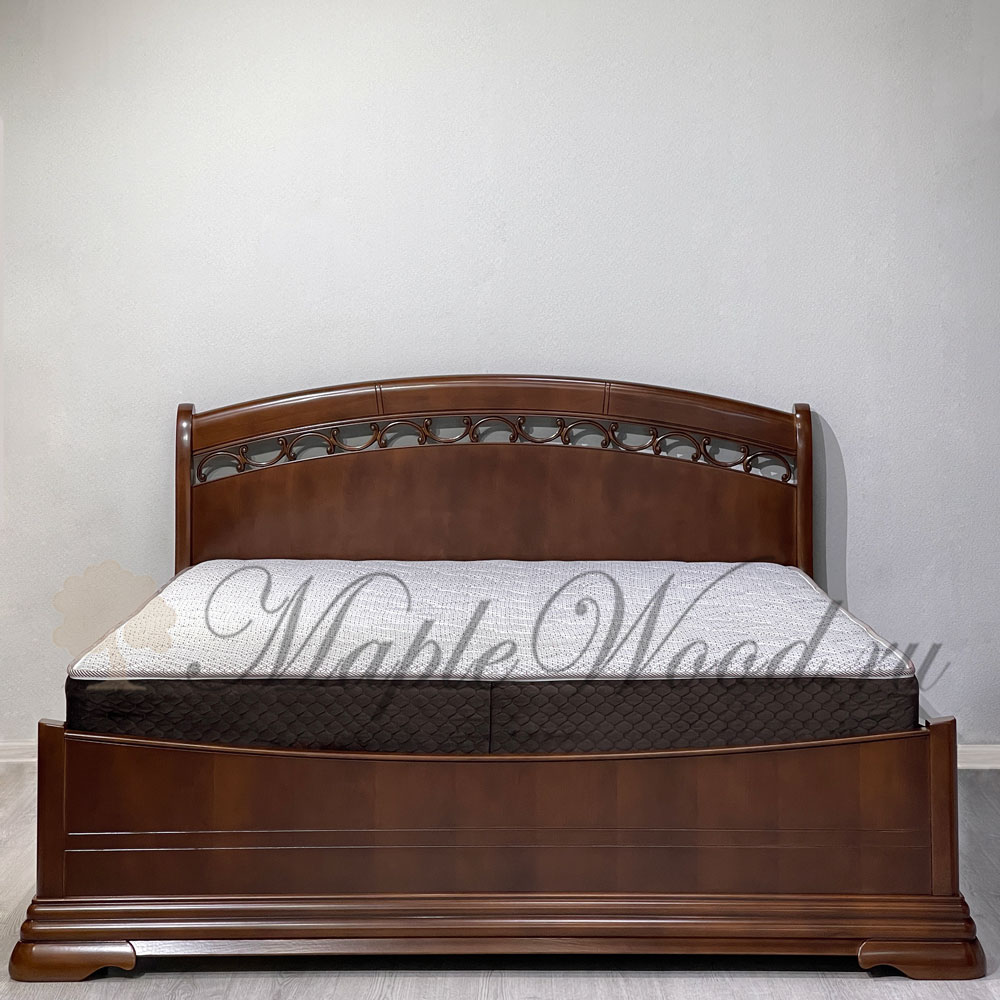 Описание Двуспальная кровать с резным орнаментом на изголовье от фабрики Мобекс | Mobex из коллекции Элеганс выполнена из массива дерева бука в темной отделке орех, сочетая в себе элегантные формы и сдержанный стиль классики.