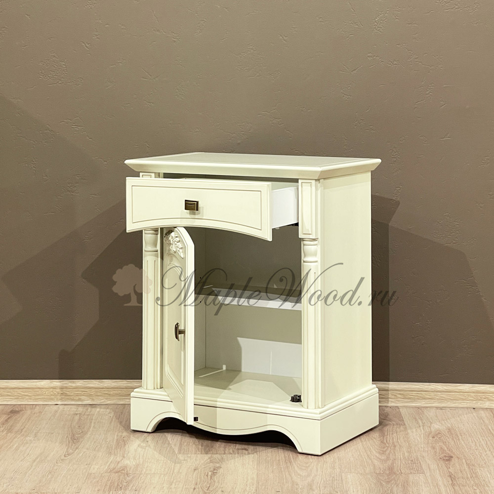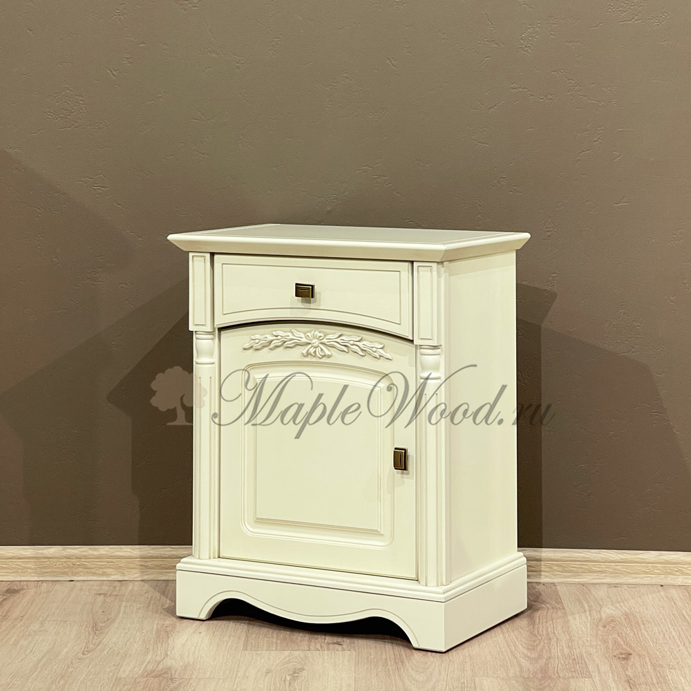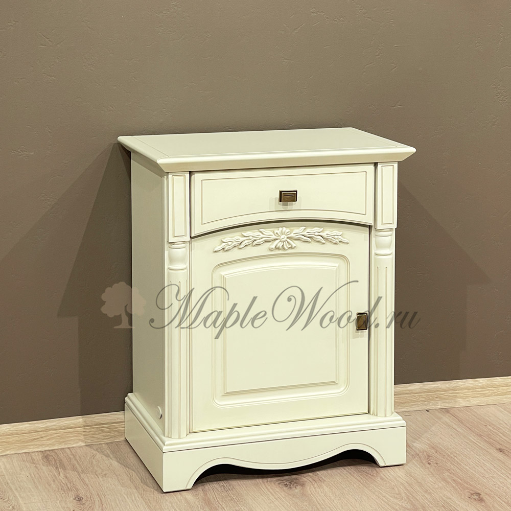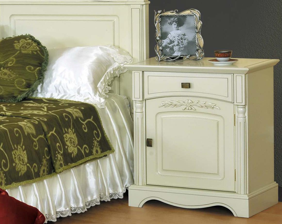 Прикроватная тумба из коллекции Анна от фабрики Мобекс | Mobex выполнена в нежном стиле прованс из натурального дерева бука в светлом оттенке слоновая кость и декорирована контрастной патиной, которая завершает дизайн изделия.