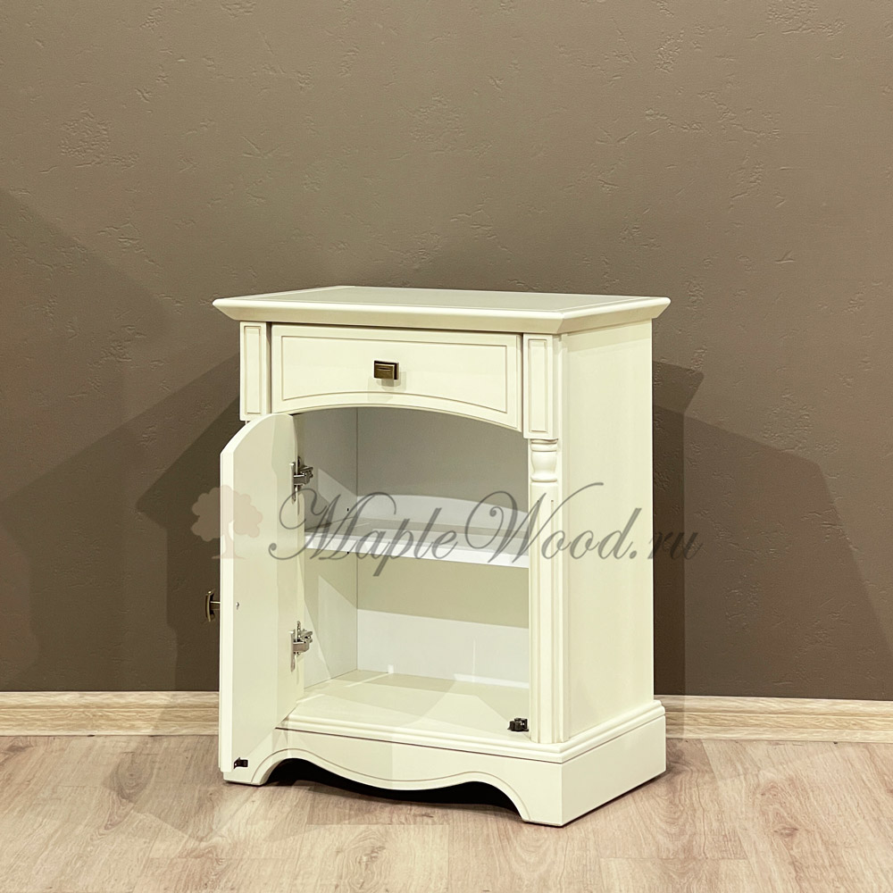 Тумба оборудована выдвижным ящиком и полкой за распашной дверцей.