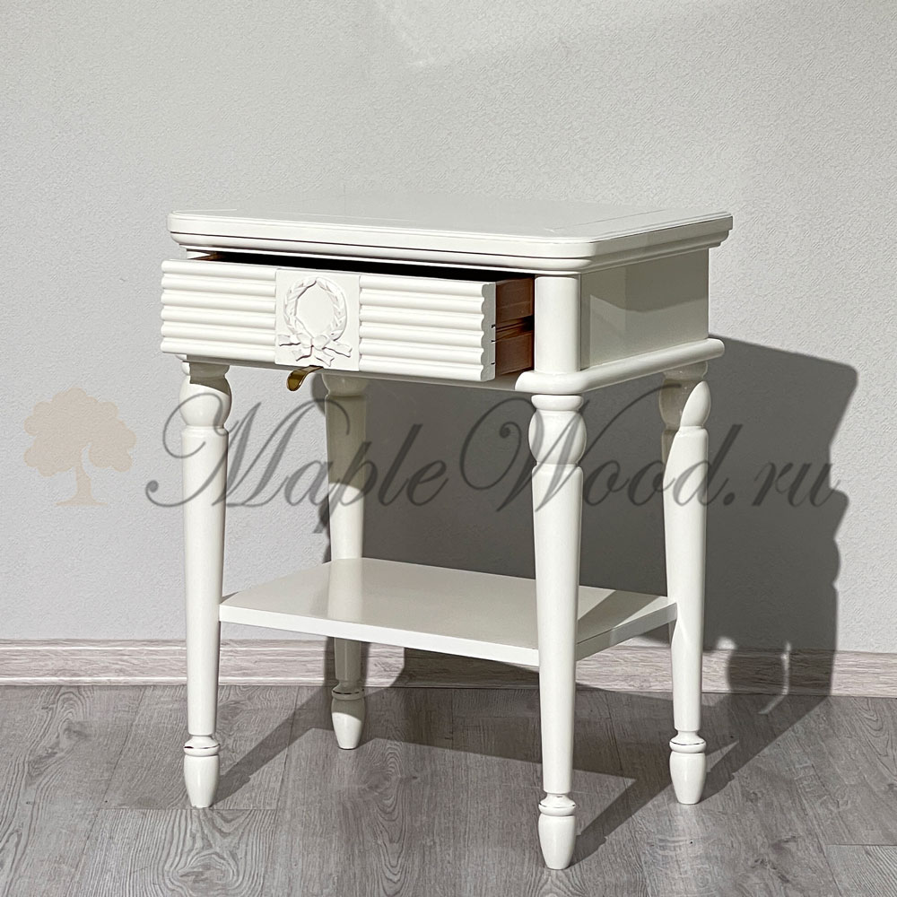 Оригинальная прикроватная тумба на высоких ножках из коллекции Мария Сильва от фабрики Monte Cristo Mobili оснащена одним выдвижным ящиком и открытой полкой, на которой можно разместить книги, журналы или другие элементы декора.