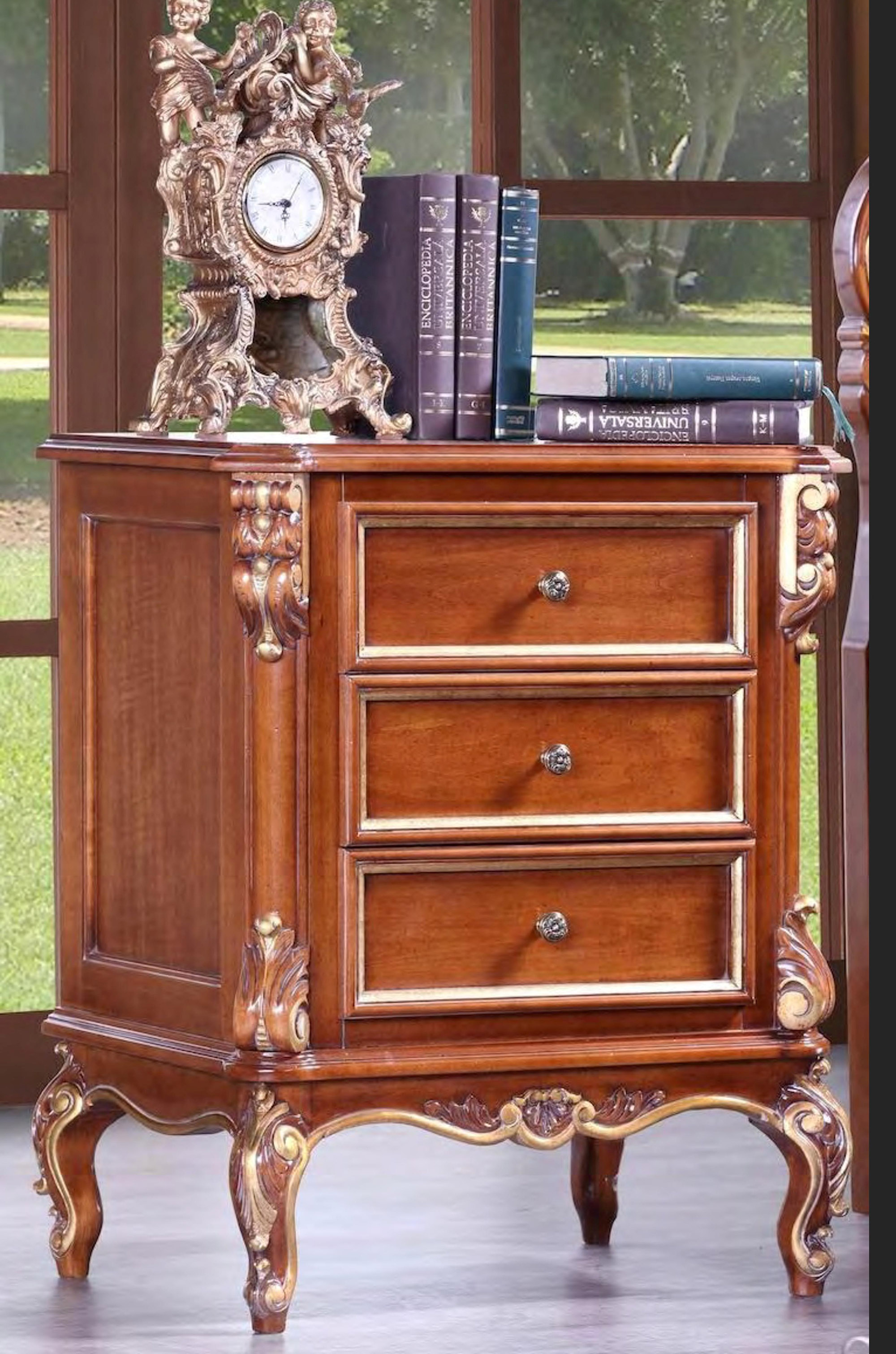 Прикроватная тумба с тремя выдвижными ящиками из коллекции Палермо от фабрики Монте Кристо Мобили | Monte Cristo Mobili выполнена из массива дерева, украшена искусной резьбой и элегантными металлическими ручками, такое сочетание декора создает вневременной образ изделия, который станет украшением любой спальни, оформленной в классическом стиле.