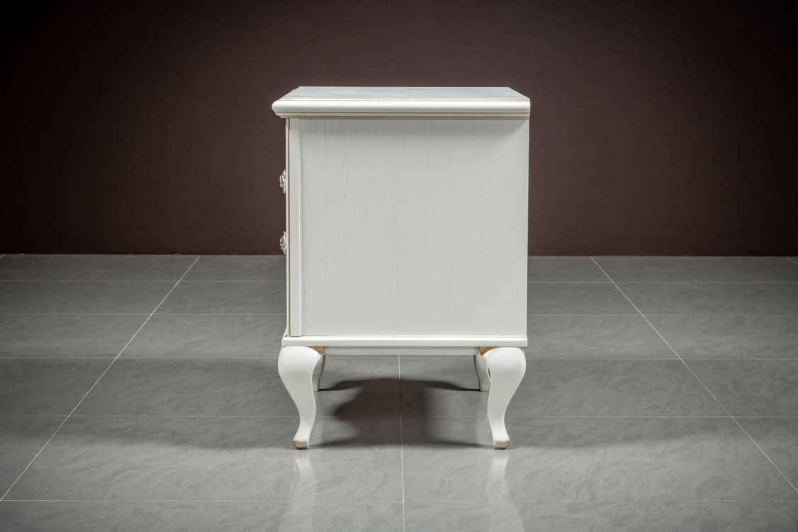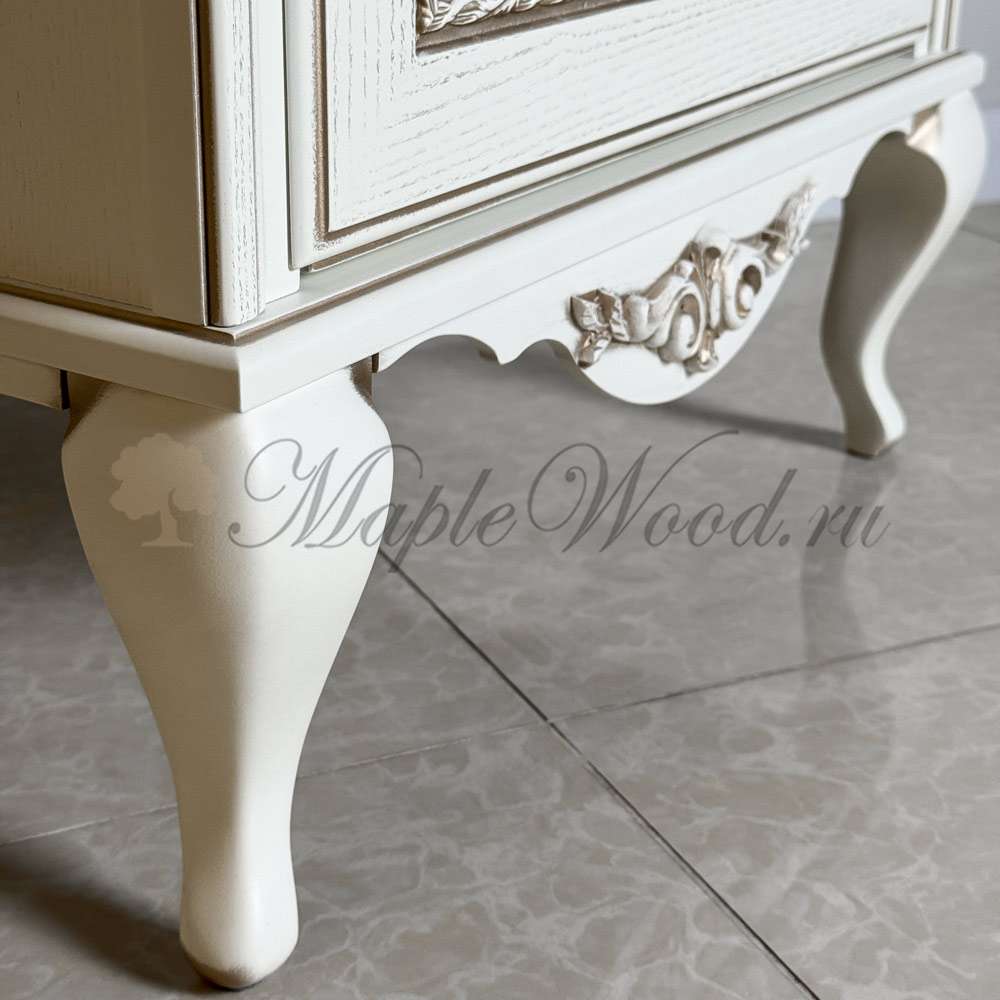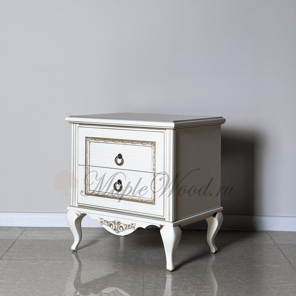 Прикроватная тумба из коллекции Неаполь от фабрики Тимбер - классическая модель на фигурных ножках, оборудованная двумя выдвижными ящиками, которые оснащены системой плавного закрывания.