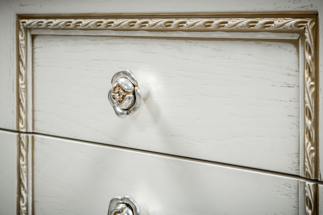 Тумба выполнена в нежном оттенке айвори из шпонированного МДФ с элементами из массива дерева и декорирована золотой патиной, которая подчеркивает акцентные детали изделия.