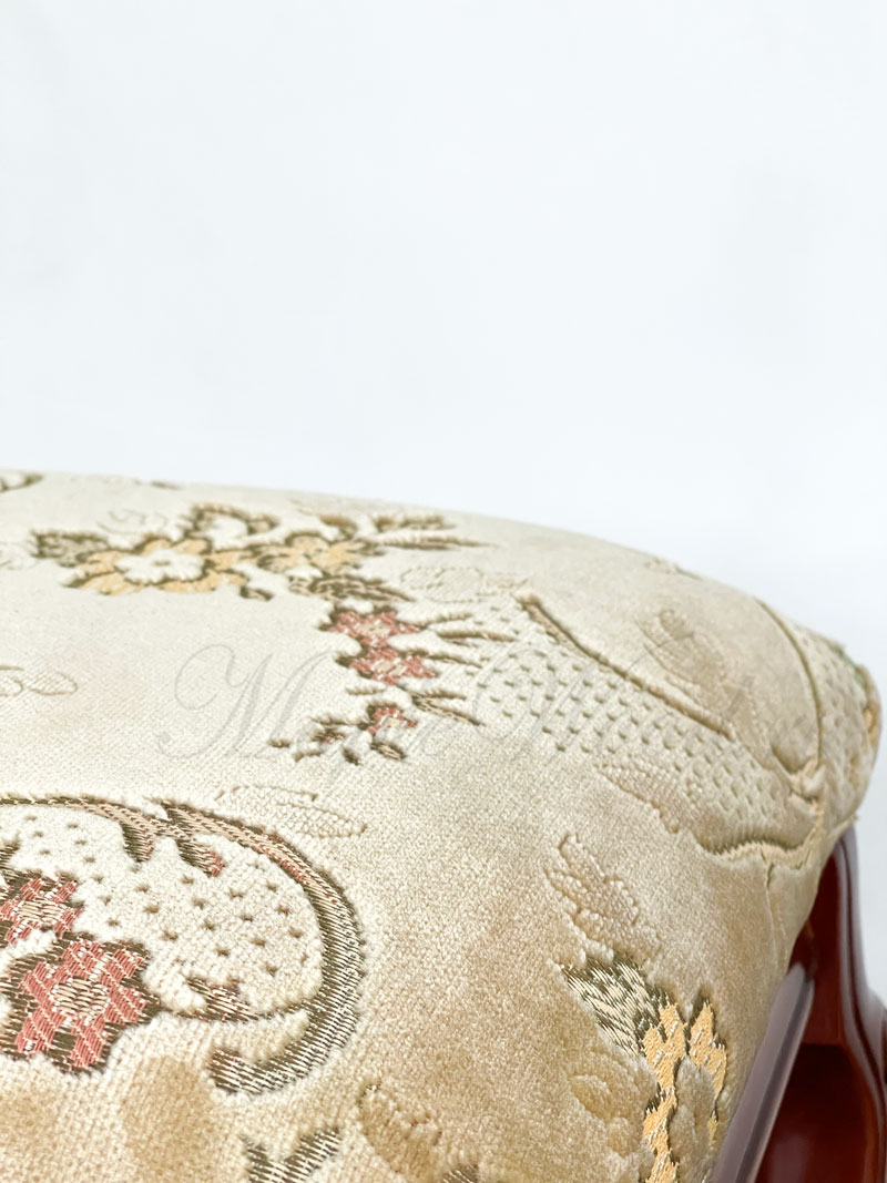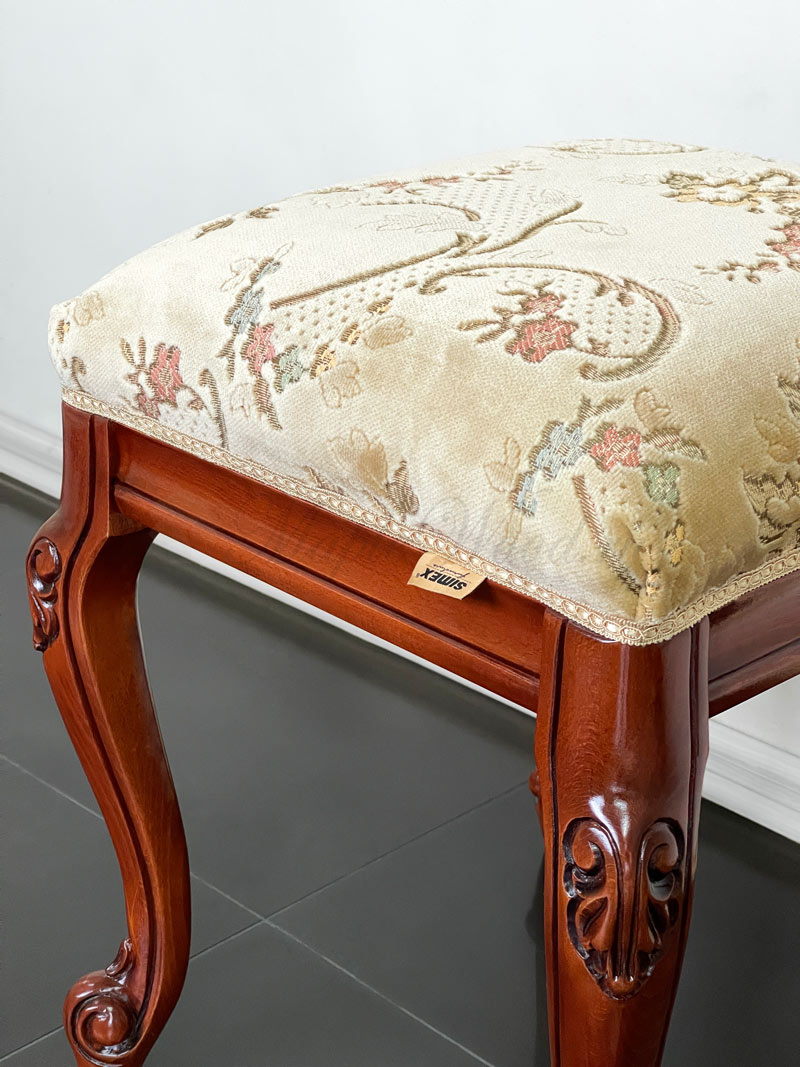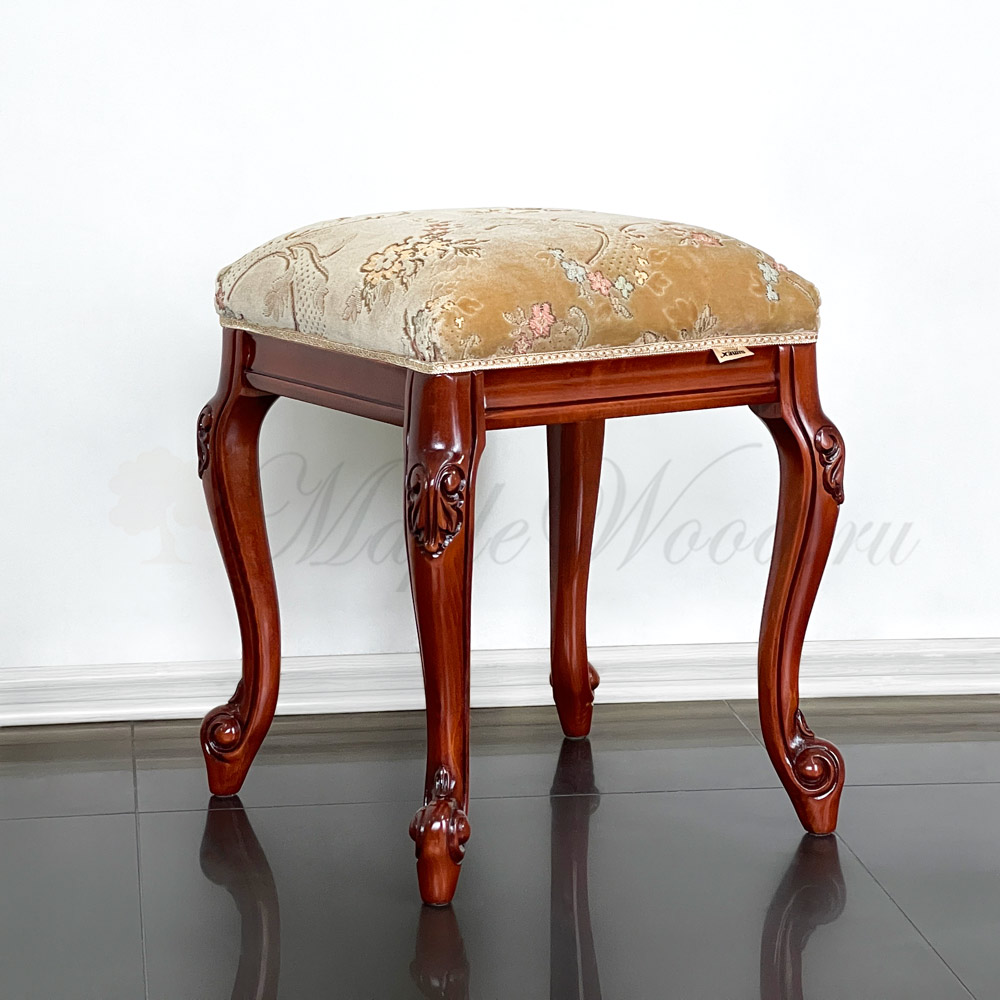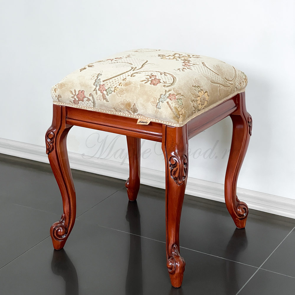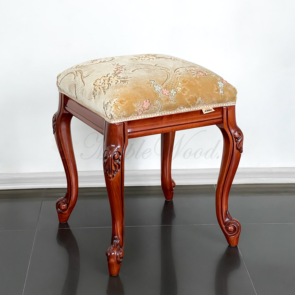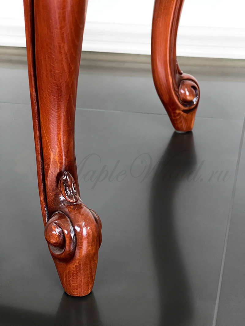 Каркас изделия выполнен из натурального массива дерева, а обивка сиденья на объёмном слое наполнителя предоставляется на выбор из каталога фабрики.