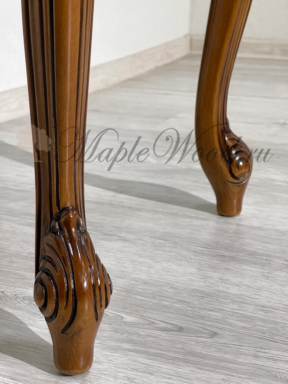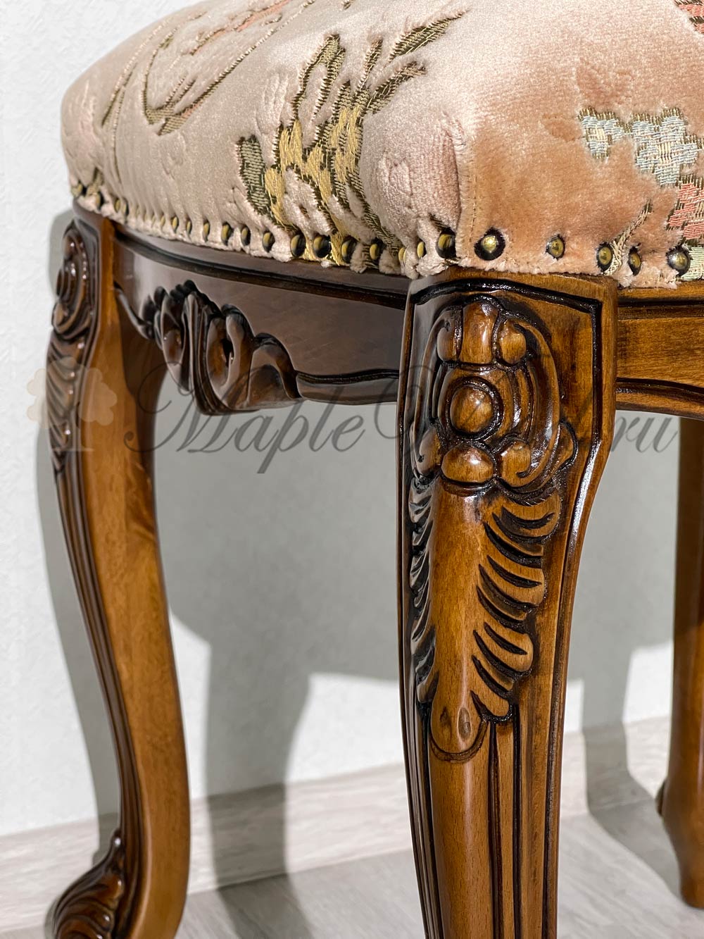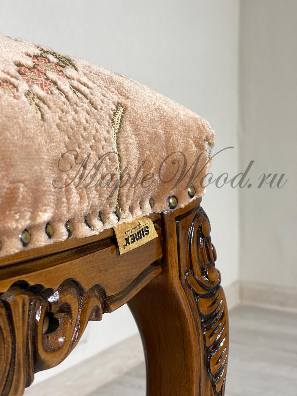 Каркас изделия выполнен из натурального дерева и декорирован резными элементами, которые подчеркивает классический дизайн изделия, а цвет и материал обивки предоставляется на выбор из каталога фабрики.