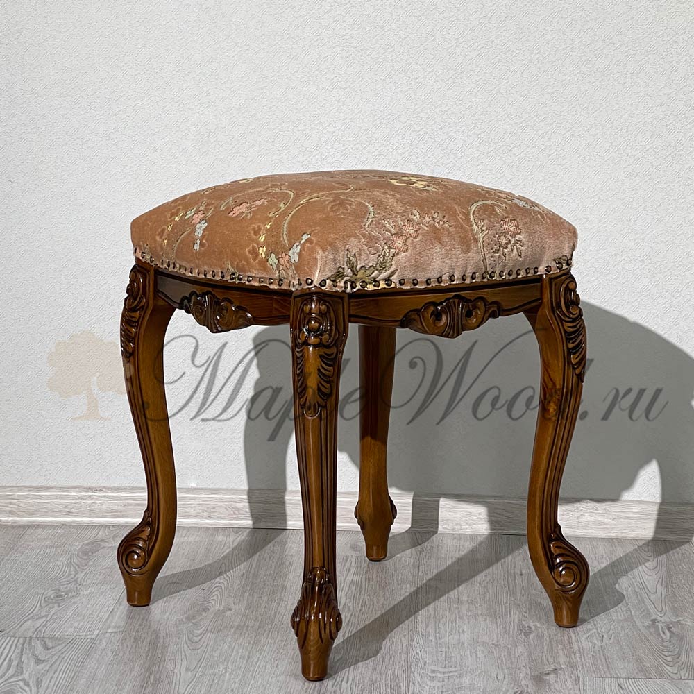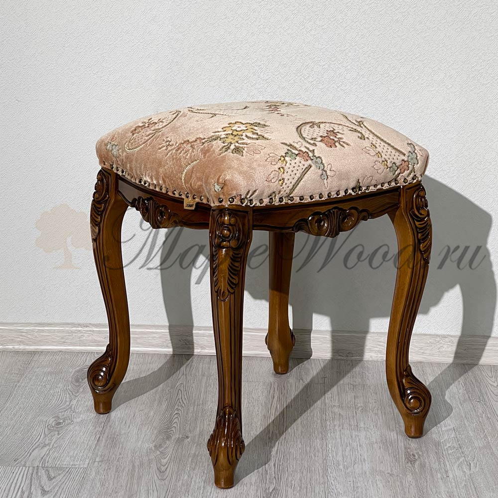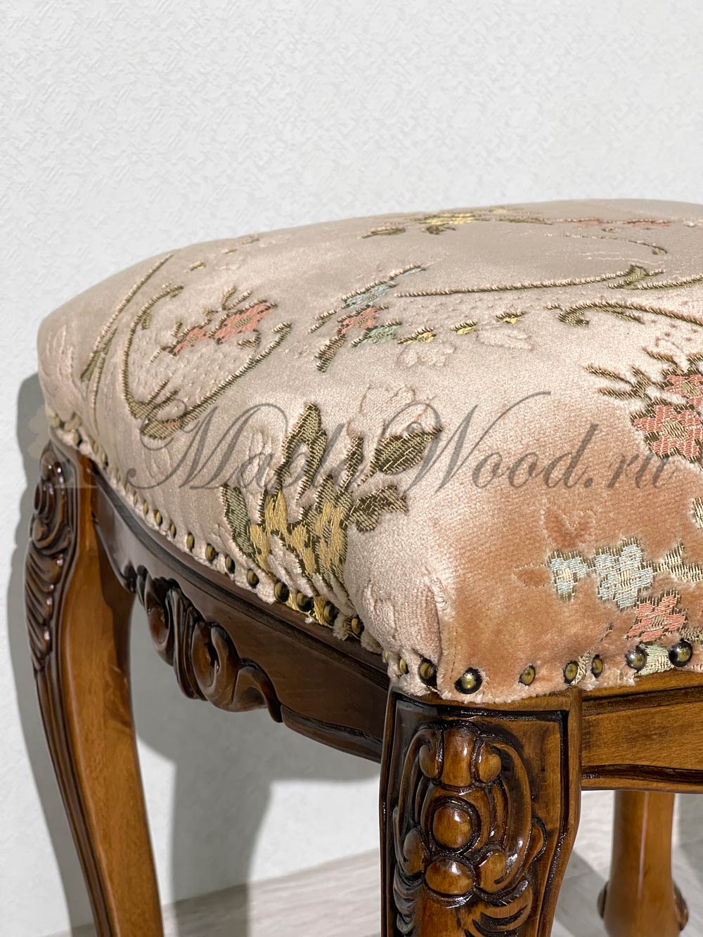 Каркас изделия выполнен из натурального дерева и декорирован резными элементами, которые подчеркивает классический дизайн изделия, а цвет и материал обивки предоставляется на выбор из каталога фабрики.