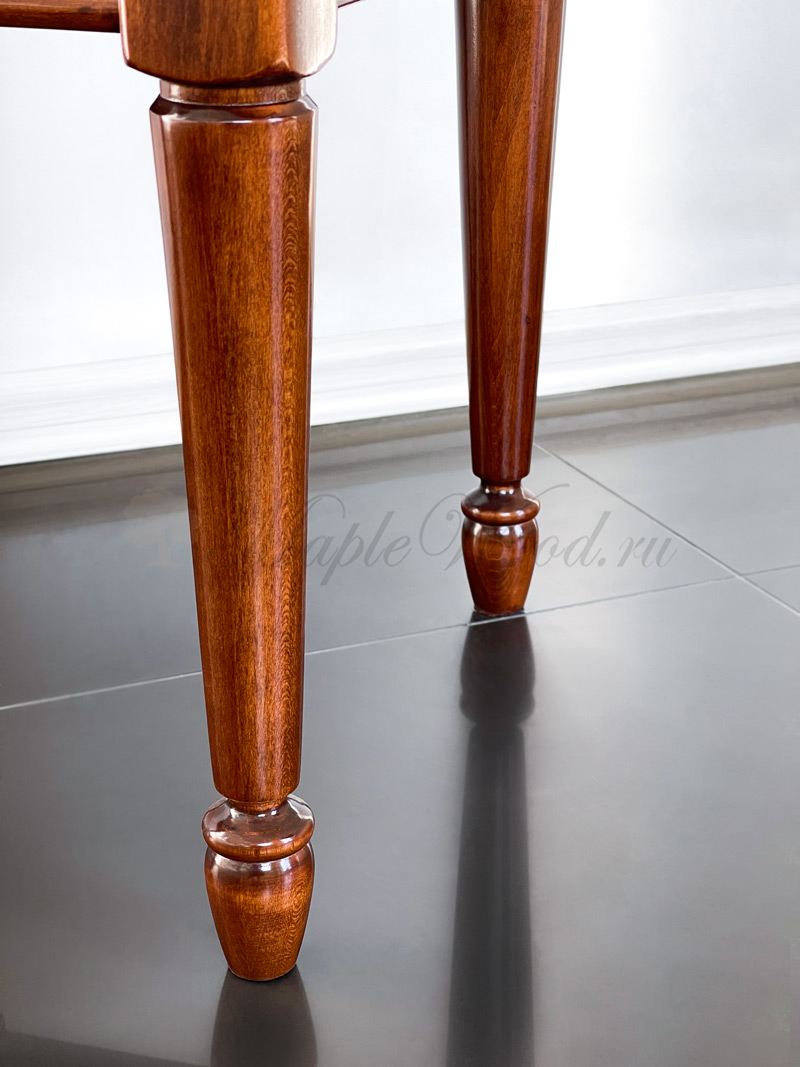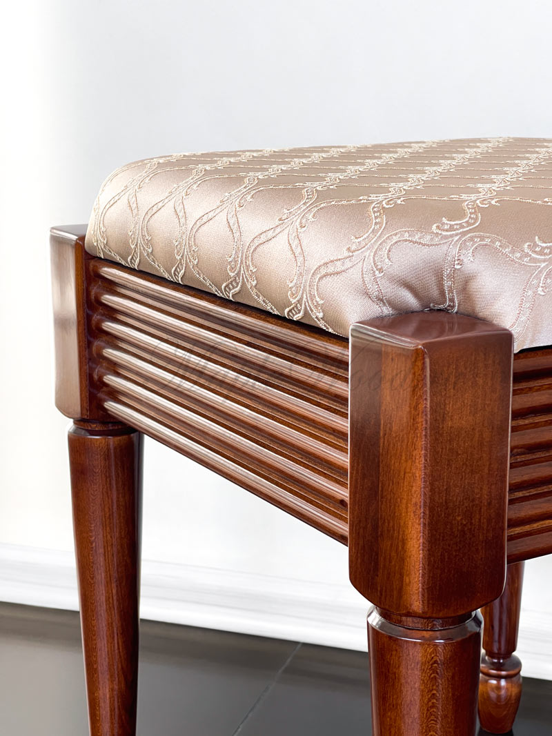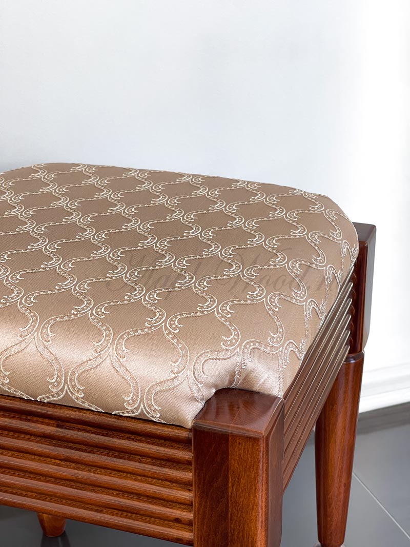 Каркас изделия выполнен из массива дерева с акцентной фрезеровкой, а обивка сиденья на объёмном слое наполнителя предоставляется на выбор из каталога фабрики.