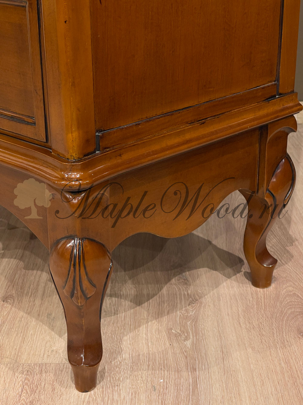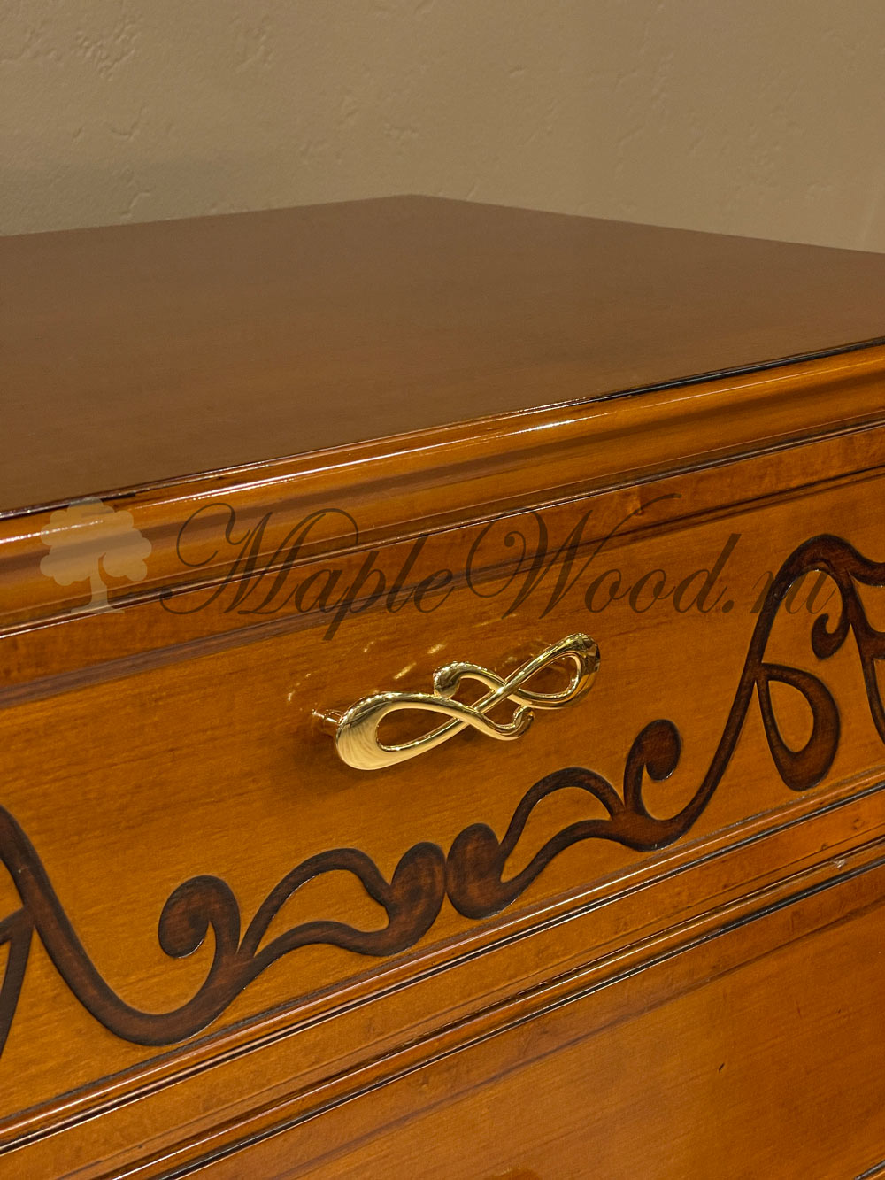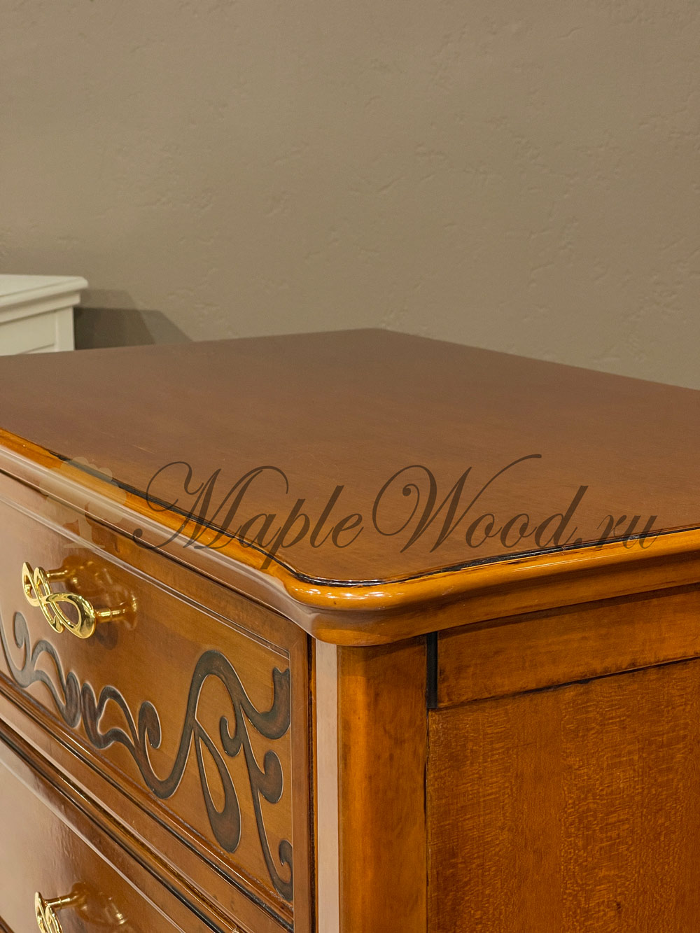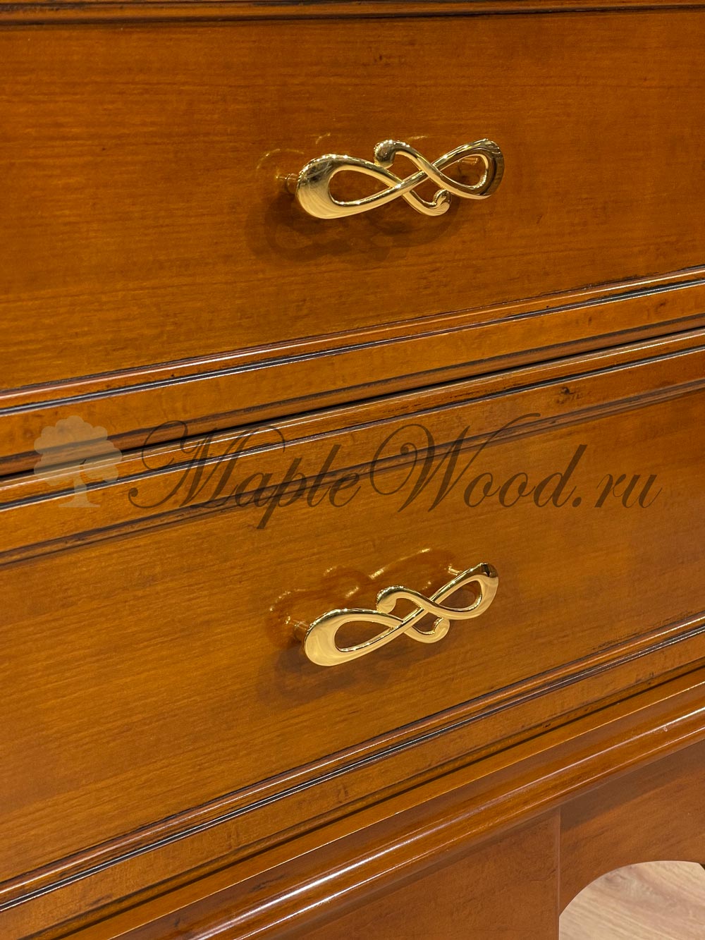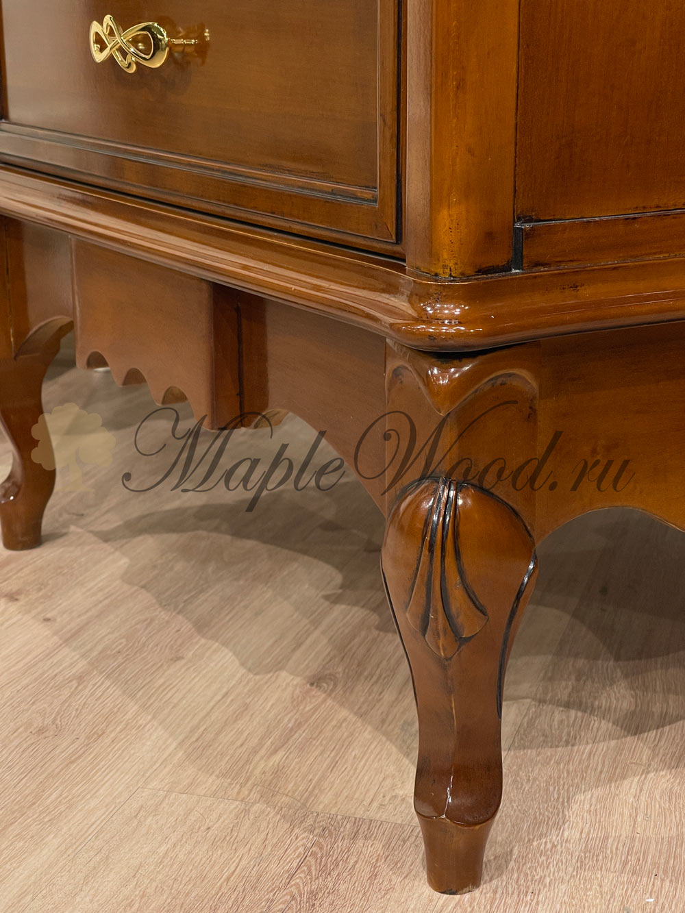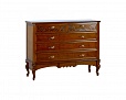 Комод выполнен в итальянском стиле из натурального дерева и декорирован лаконичными резными элементами и золотой фурнитурой, которая придает изделию законченный вид.