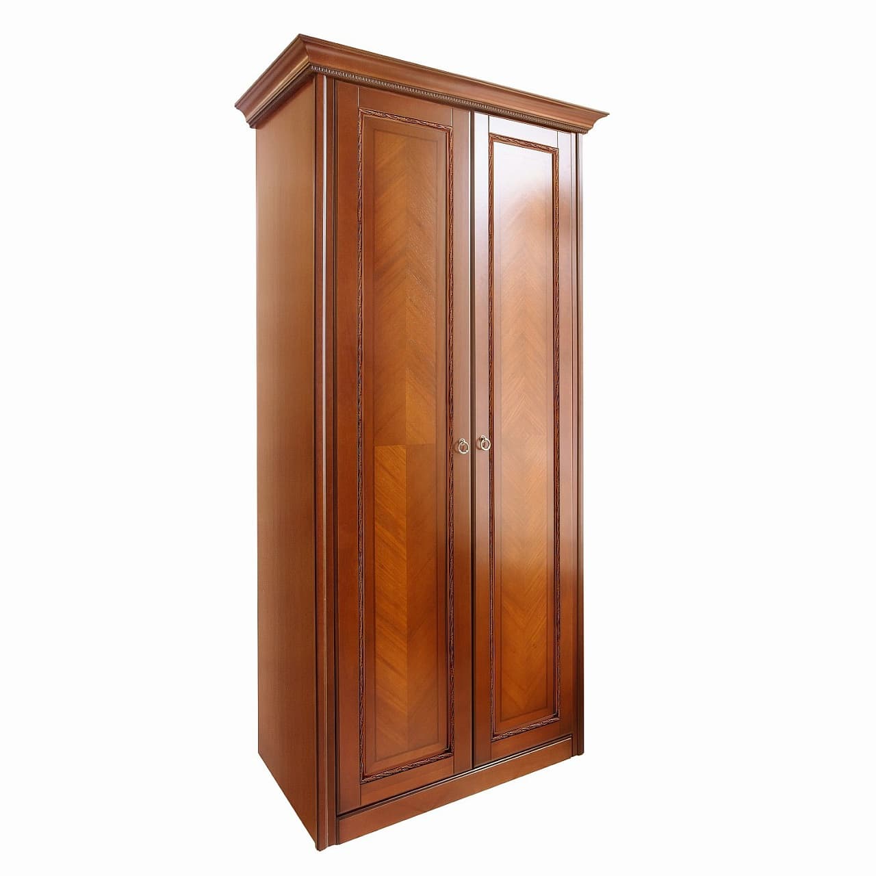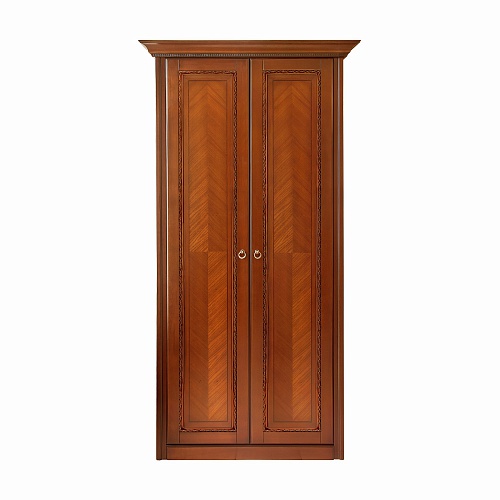 Небольшой 2-х дверный шкаф из коллекции Палермо от фабрики Тимбер выполнен в классическом стиле из шпонированного МДФ с элементами из массива дерева и декорирован контрастной патиной, которая подчеркивает акцентные детали изделия.