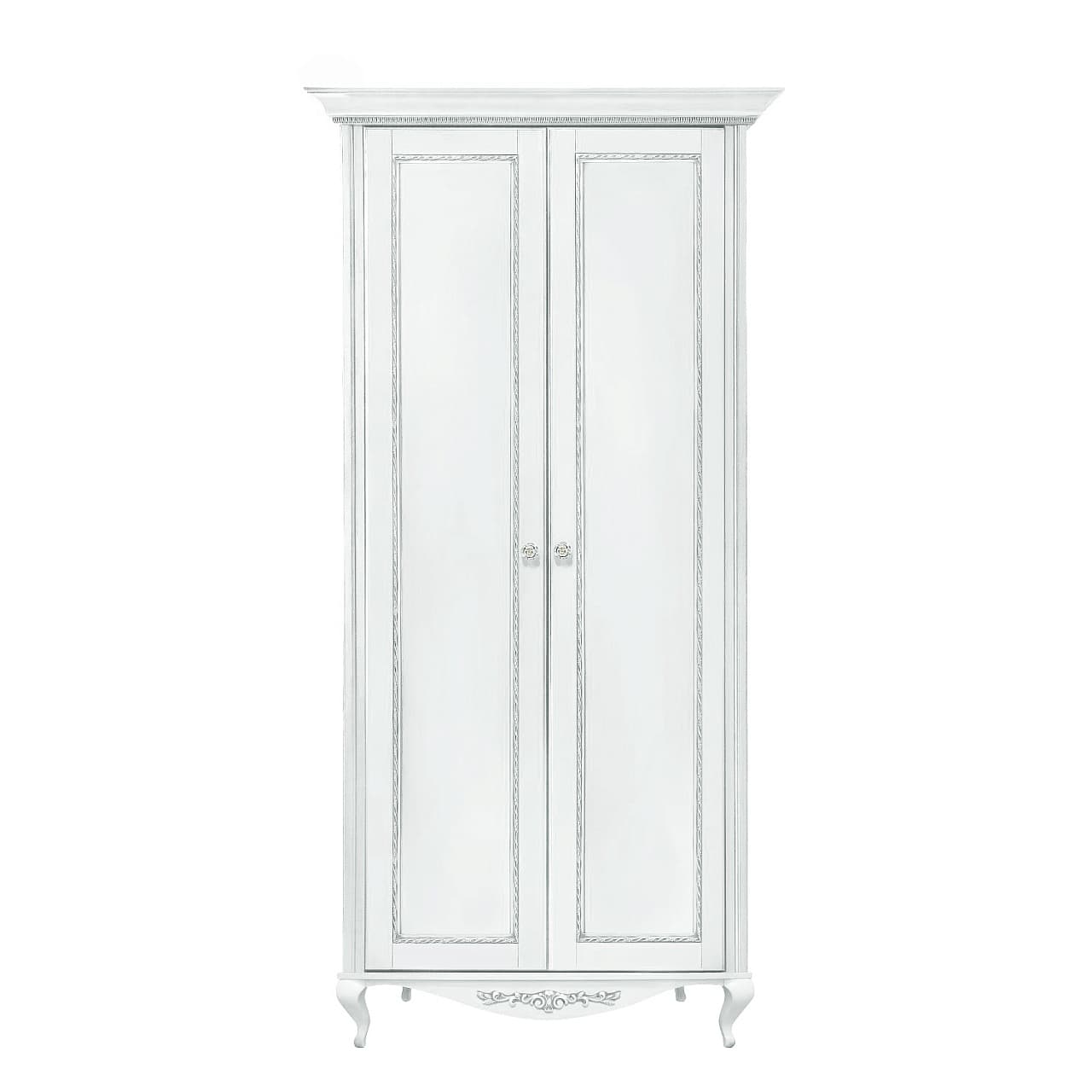 Распашной 2-х дверный шкаф на фигурных ножках из коллекции Неаполь от фабрики Тимбер выполнен в классическом стиле из шпонированного МДФ с элементами из массива дерева и декорирован серебряной патиной, которая подчеркивает акцентные детали изделия.