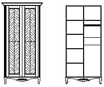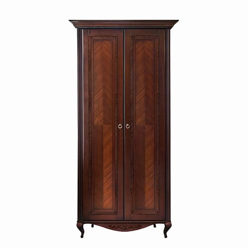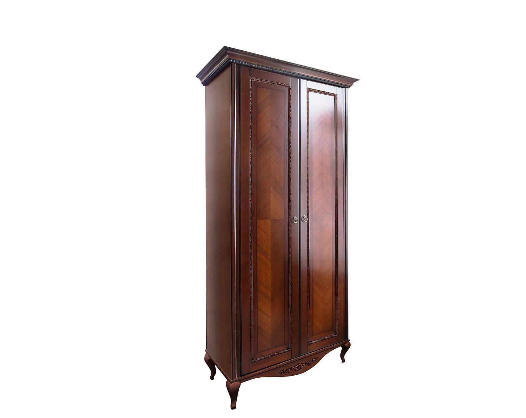 Распашной 2-х дверный шкаф на фигурных ножках из коллекции Неаполь выполнен в благородном оттенке орех из шпонированного МДФ с элементами из массива дерева и декорирован эффектной инкрустацией и контрастной патиной, которая завершает классический дизайн изделия.