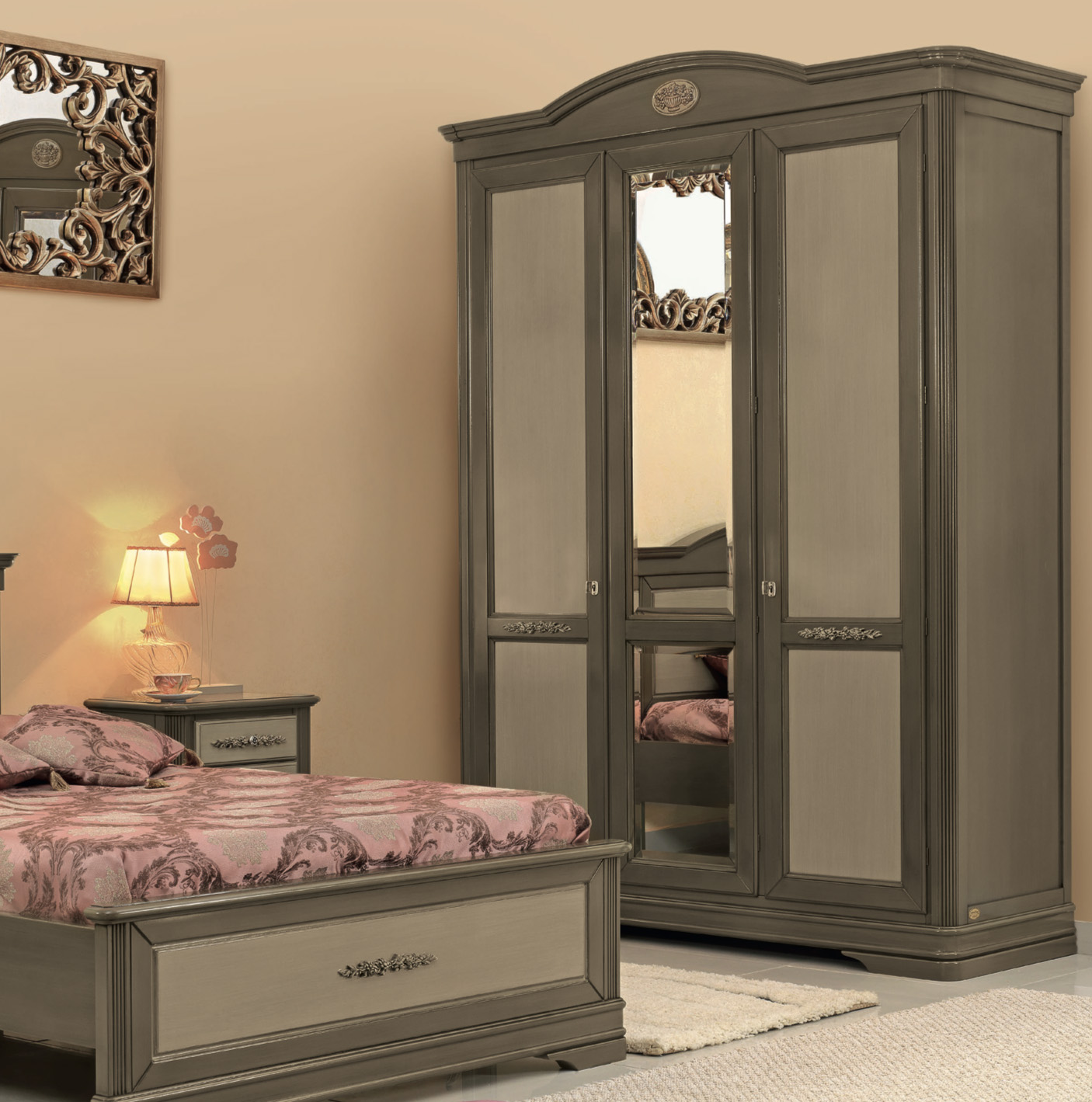 Распашной 3-х дверный шкаф для спальни из коллекции Артемида от фабрики Monte Cristo Mobili выполнен в неоклассическом стиле из натурального массива дерева в красивом оливковом оттенке.