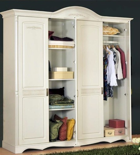 Распашной 4-х дверный шкаф из коллекции Анна от фабрики Мобекс | Mobex выполнен в нежном стиле прованс из натурального дерева бука в светлом оттенке слоновая кость и декорирован контрастной патиной, которая завершает дизайн изделия.