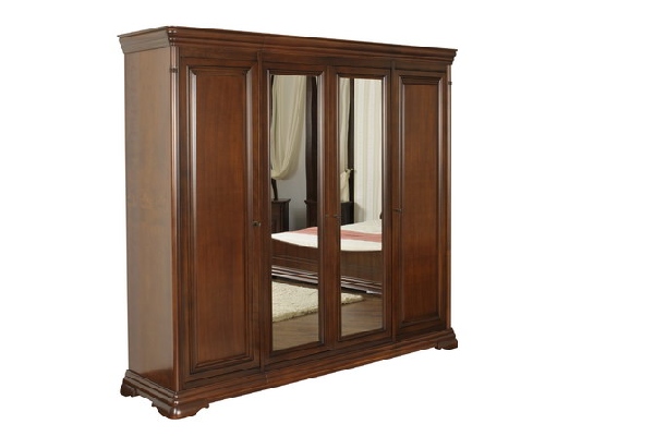 Большой и вместительный 4-х дверный шкаф с зеркальными вставками из коллекции Элеганс от фабрики Мобекс | Mobex выполнен из массива дерева в темной отделке орех, сочетая в себе элегантную форму и сдержанный стиль классики.