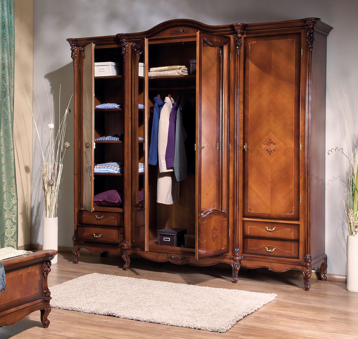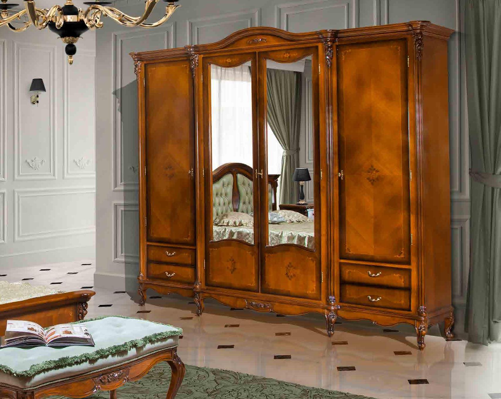 Распашной 4-х дверный шкаф Регаллис от фабрики Simex органично впишется в интерьер, оформленный в классическом стиле. Шкаф выполнен из натурального массива дерева и декорирован резьбой и инкрустацией ручной работы.