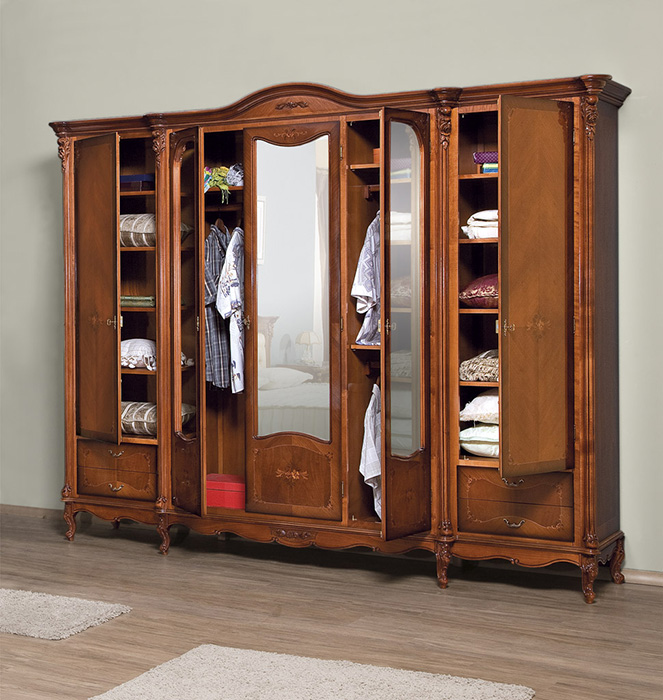 Шкаф выполнен из натурального массива дерева и декорирован искусной резьбой и инкрустацией из шпона, которая подчеркивает роскошный внешний вид изделия.