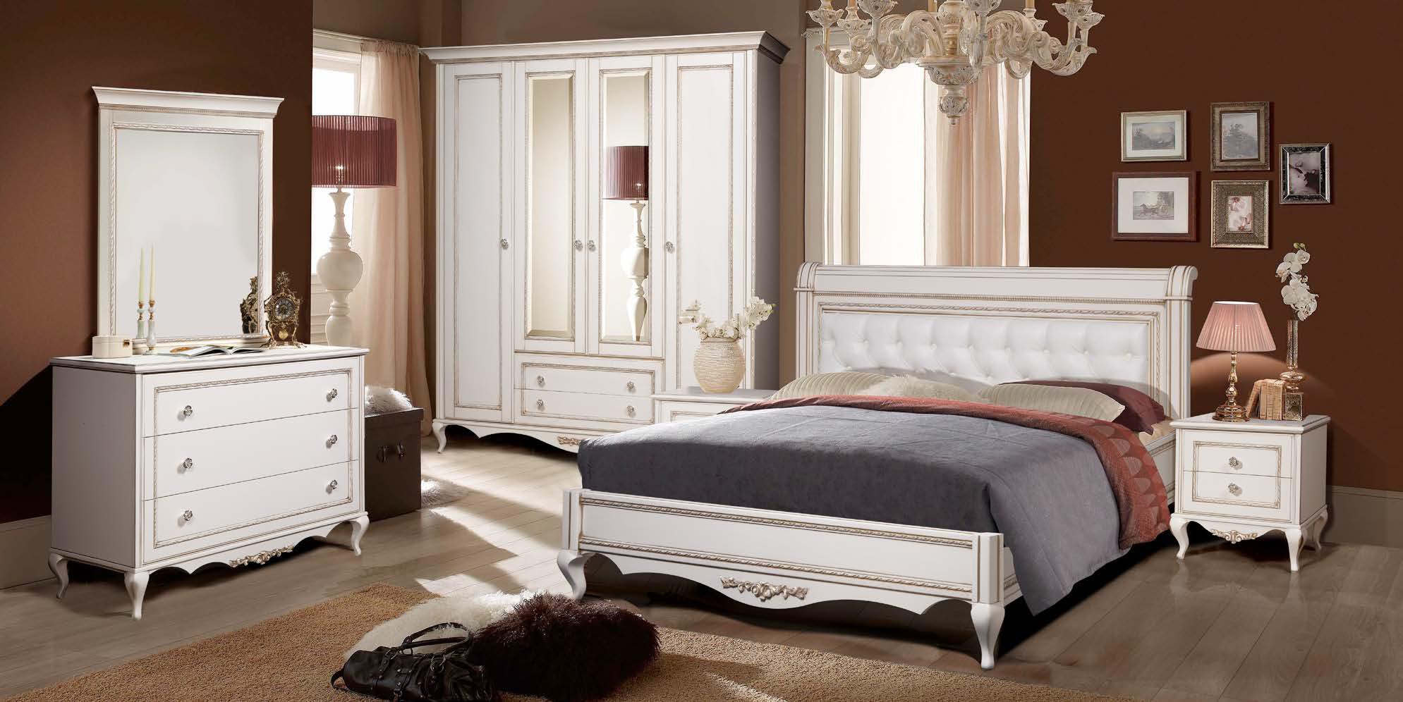 Комплект из коллекции Неаполь от фабрики Тимбер включает все необходимые предметы для полноценной меблировки спальни в классическом стиле: двуспальную кровать, прикроватные тумбы, 4-х дверный шкаф и бельевой комод, дополненный прямоугольным зеркалом.