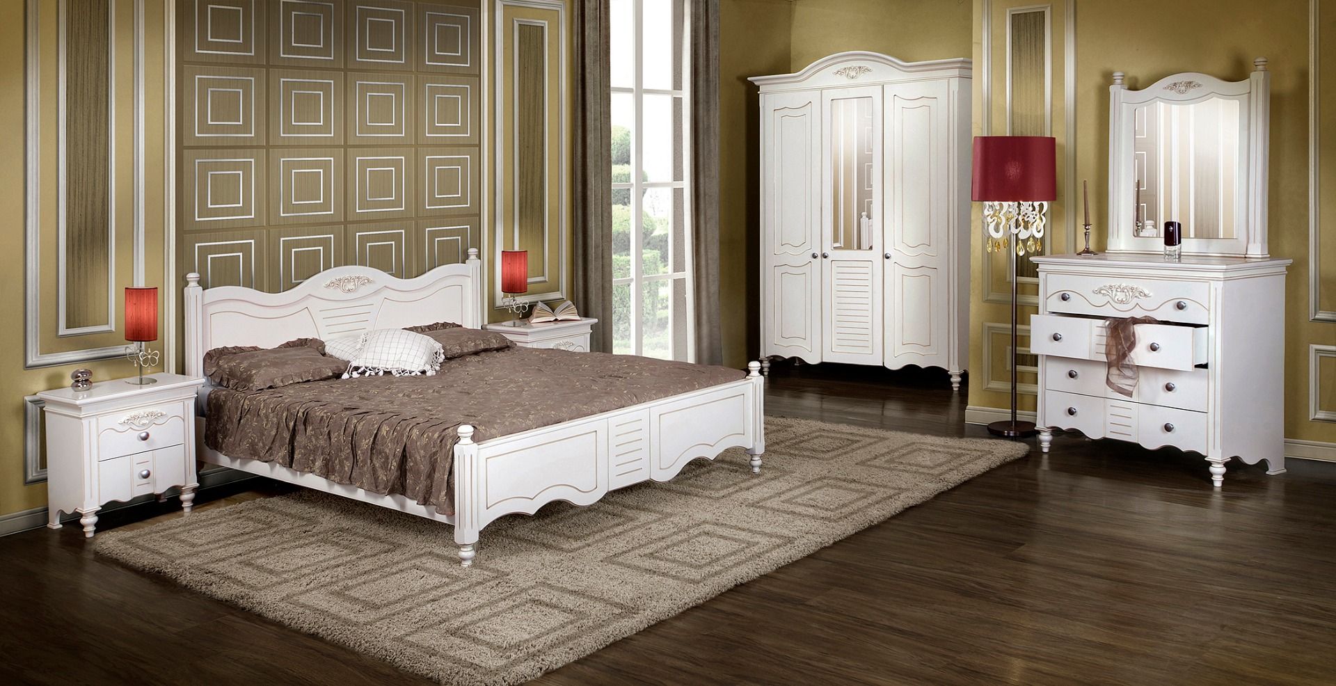 Комплект мебели из коллекции Яна от фабрики Simex включает все необходимые предметы для обустройства спальни в романтичном стиле прованс: кровать, прикроватные тумбы, 3-х дверный шкаф и бельевой комод с зеркалом.