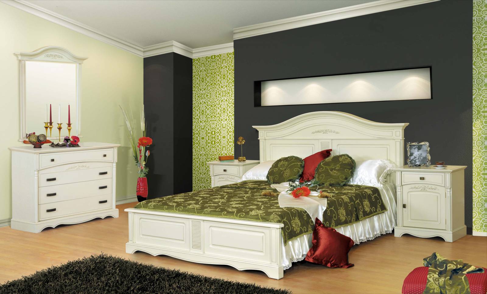 Мебель для спальни из коллекции Анна от фабрики Мобекс | Mobex включает: двуспальную кровать, прикроватные тумбы и вместительный бельевой комод с зеркалом.