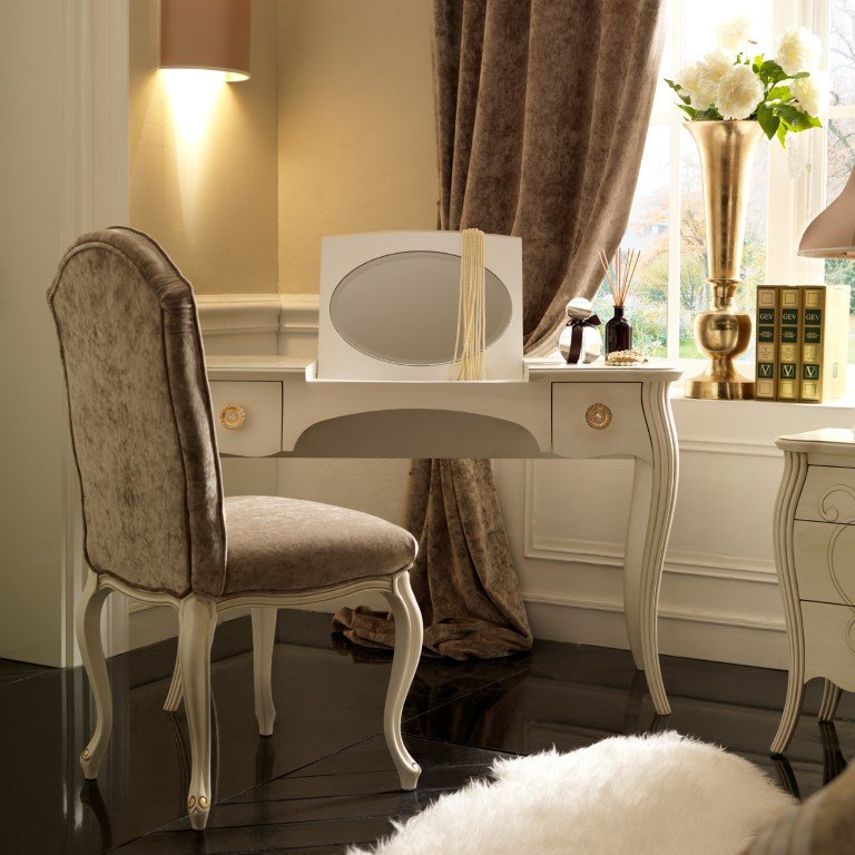 Туалетный столик из коллекции Франческо - эффектная модель на изогнутых ножках, оборудованная откидным зеркалом и двумя выдвижными ящиками для удобного хранения аксессуаров и косметических принадлежностей.