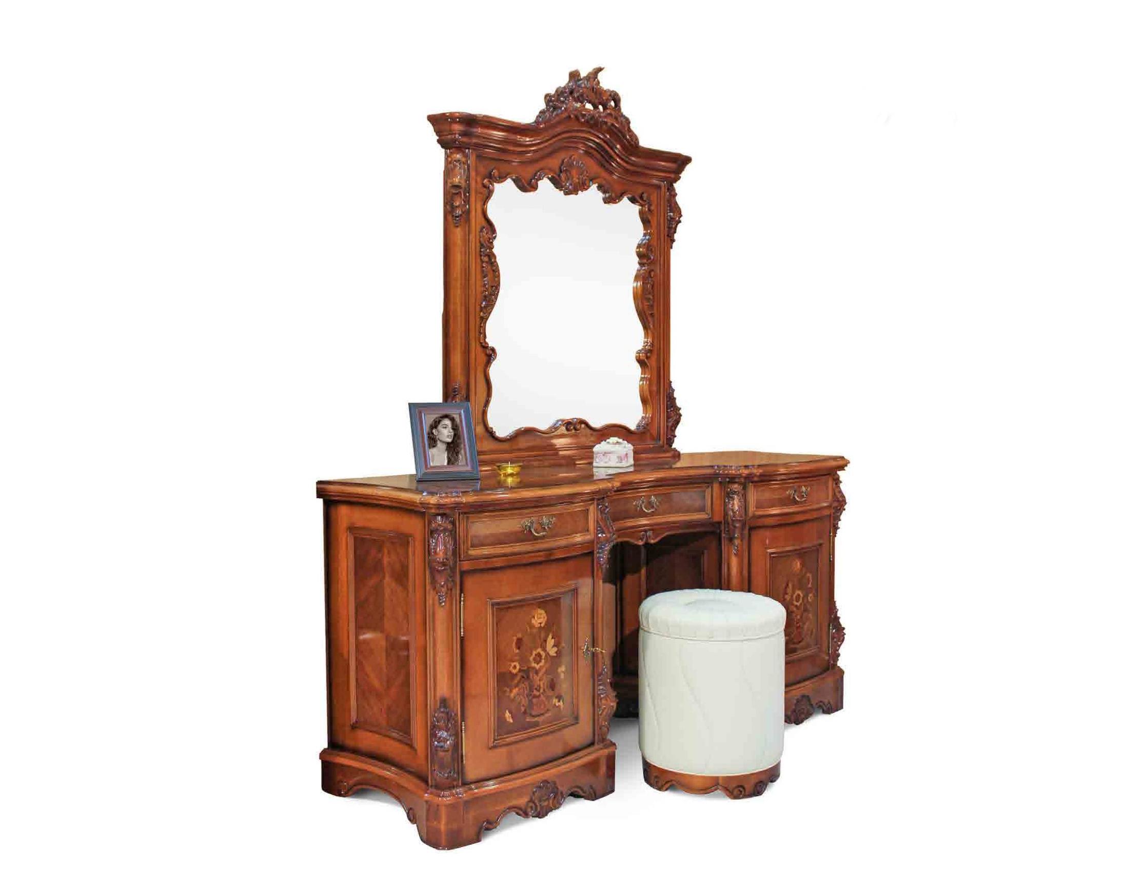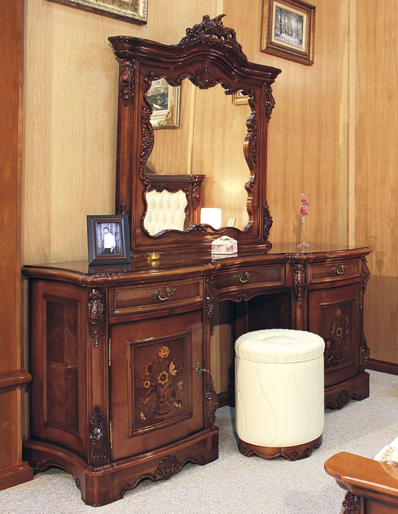 Туалетный стол из коллекции Мара Белла от фабрики Simex выполнен из натурального дерева по всем канонам классического стиля, очаровывая своей оригинальной формой и роскошной отделкой, которая включает инкрустацию и резьбу ручной работы.