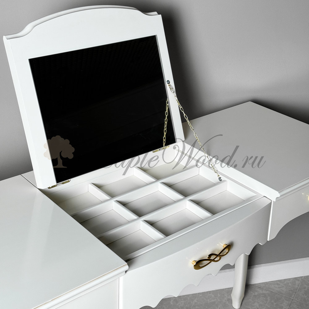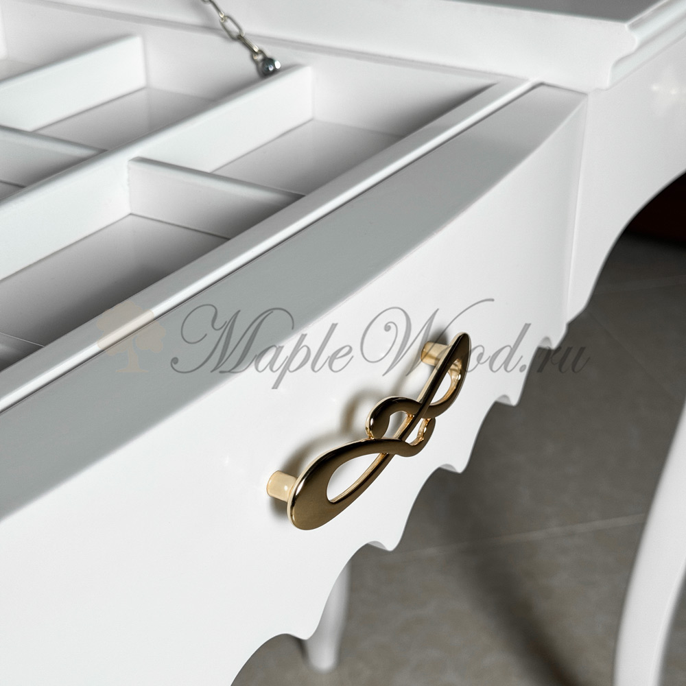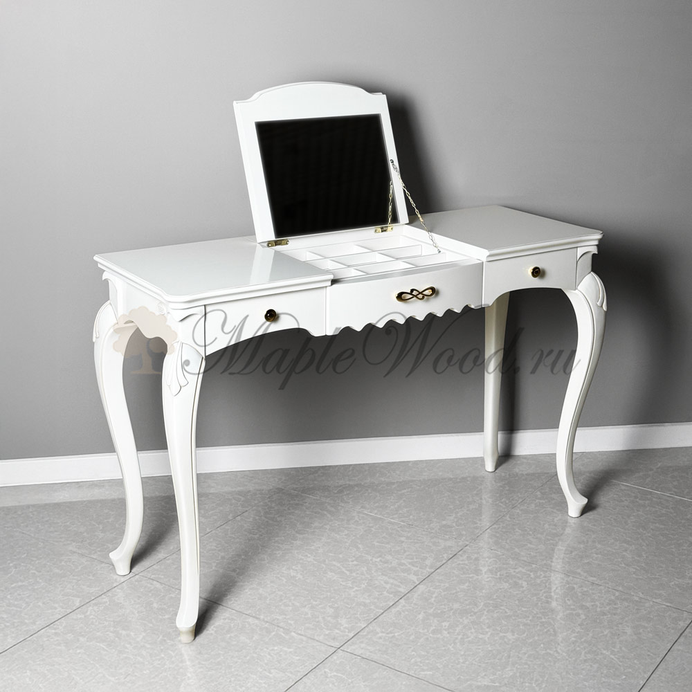 Описание Туалетный стол на фигурных ножках из коллекции Маттео от фабрики Мобекс | Mobex - модель с откидной крышкой-зеркалом и выдвижными ящиками для хранения аксессуаров и украшений.