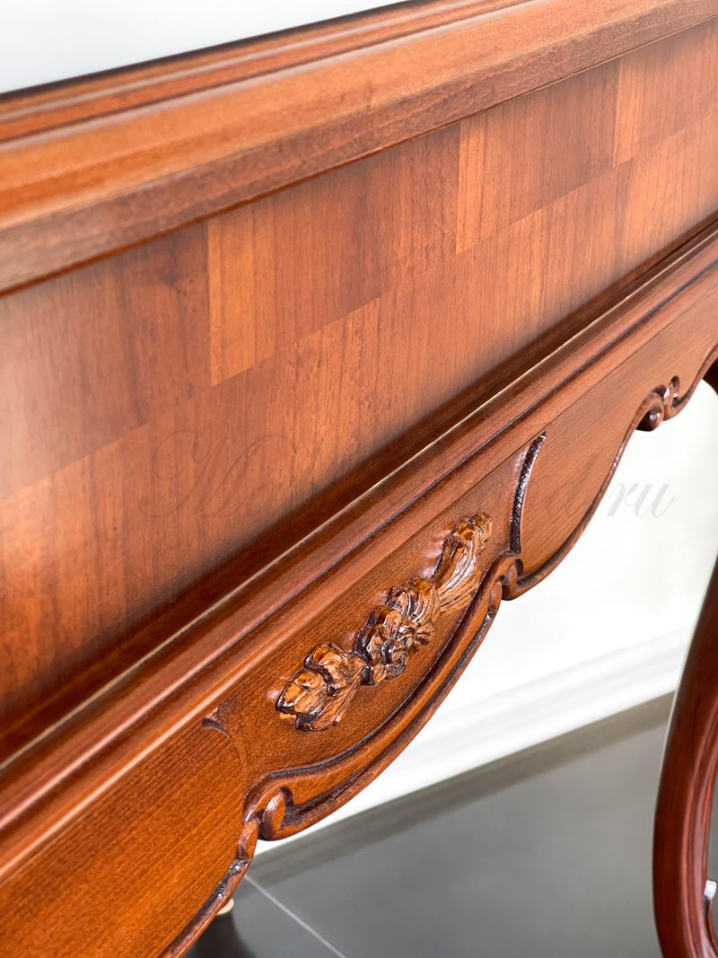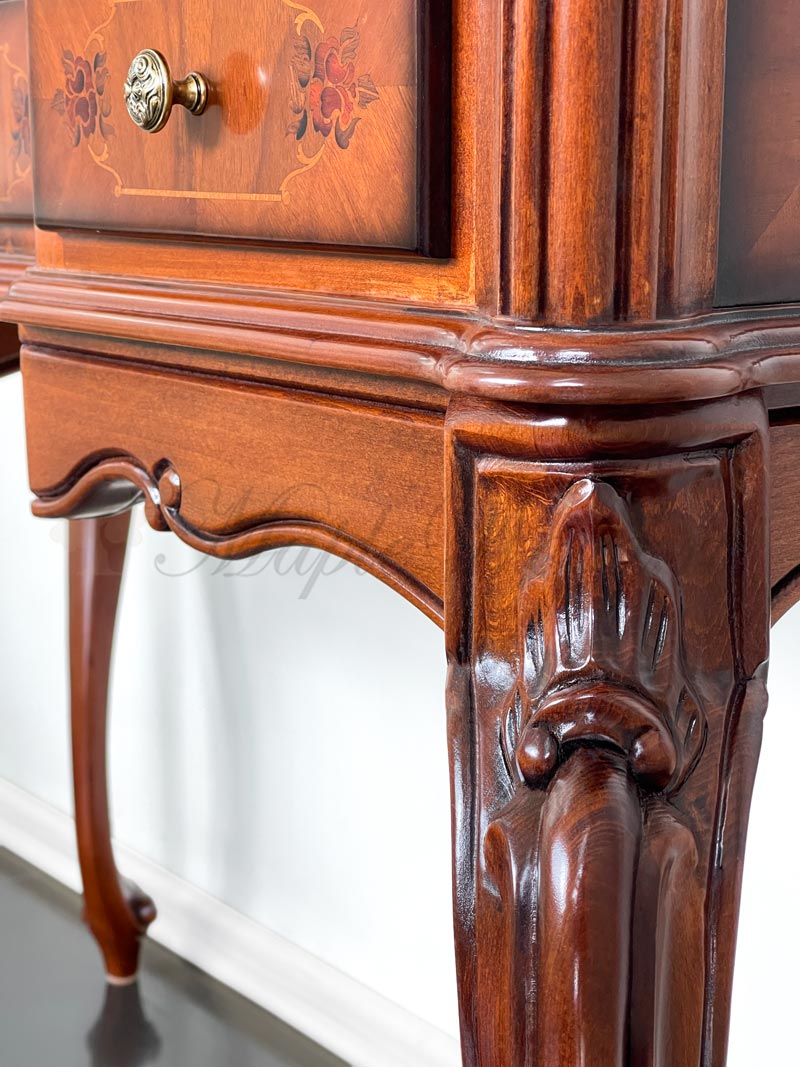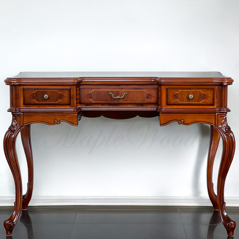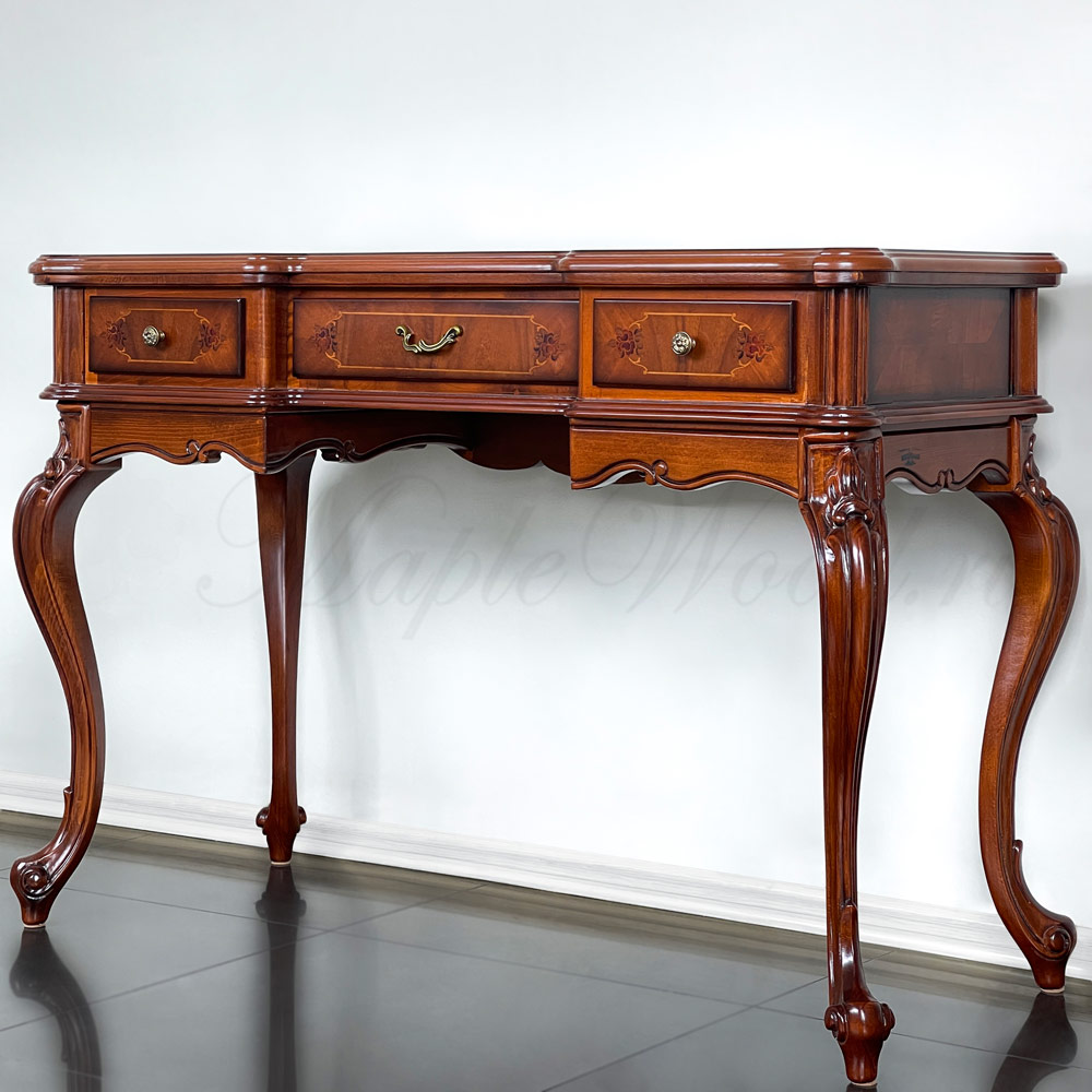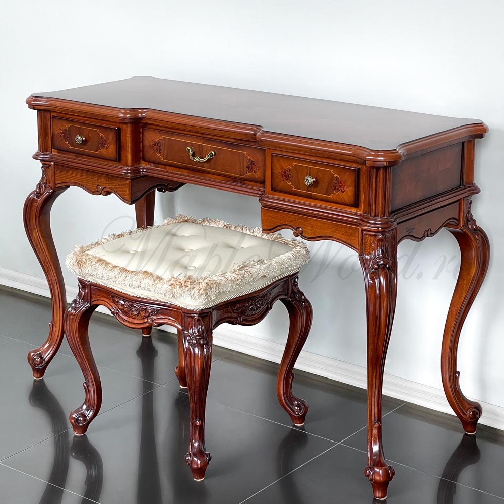 Туалетный стол на изогнутых ножках из коллекции Регаллис от фабрики Simex выполнен в классическом стиле из натурального дерева и декорирован искусной резьбой и инкрустацией из шпона.