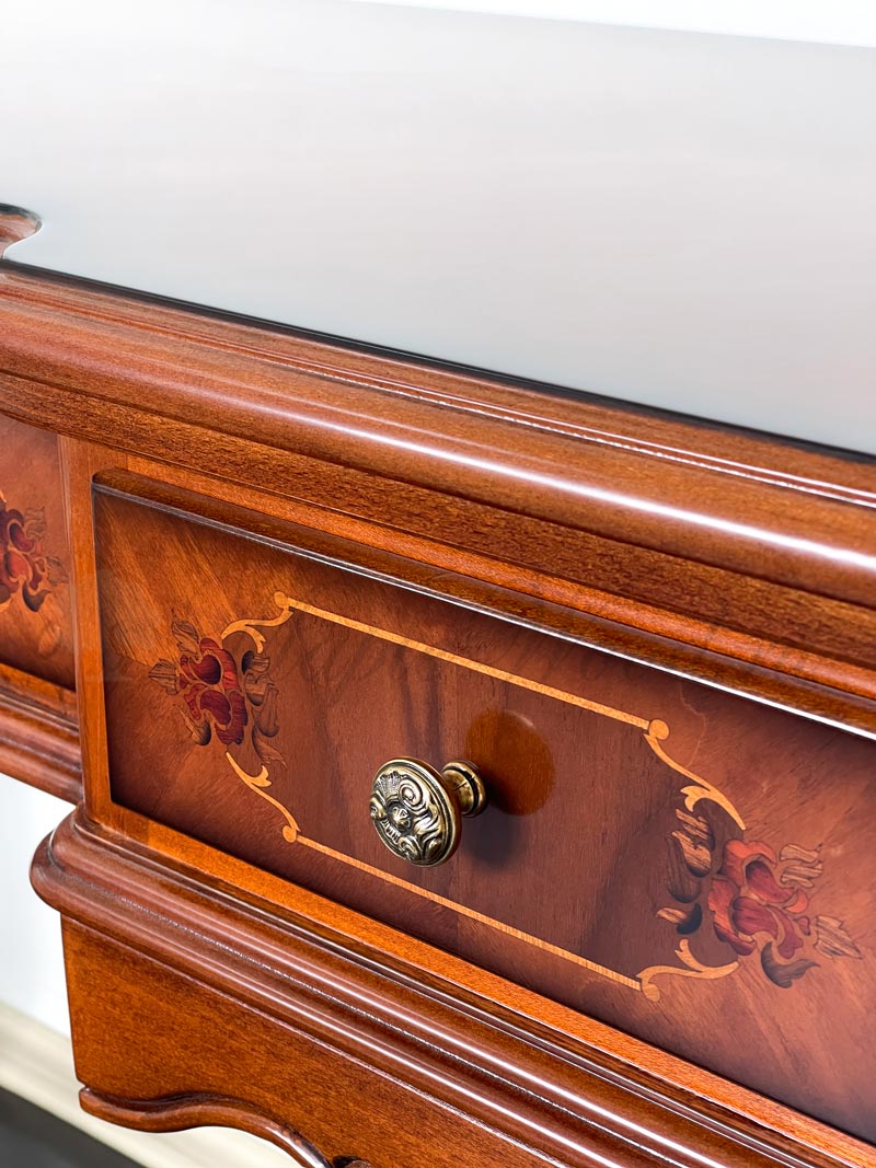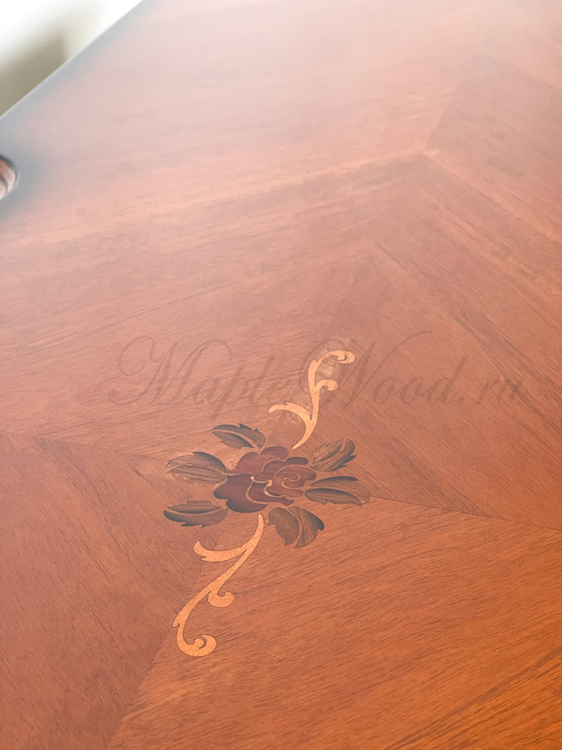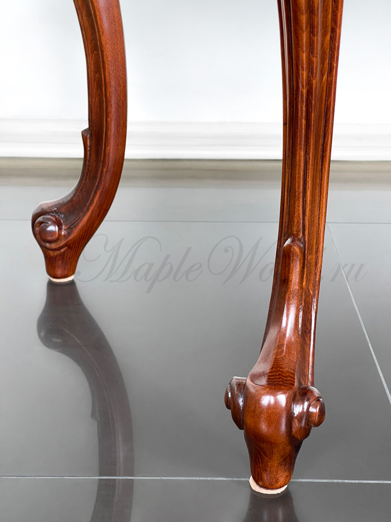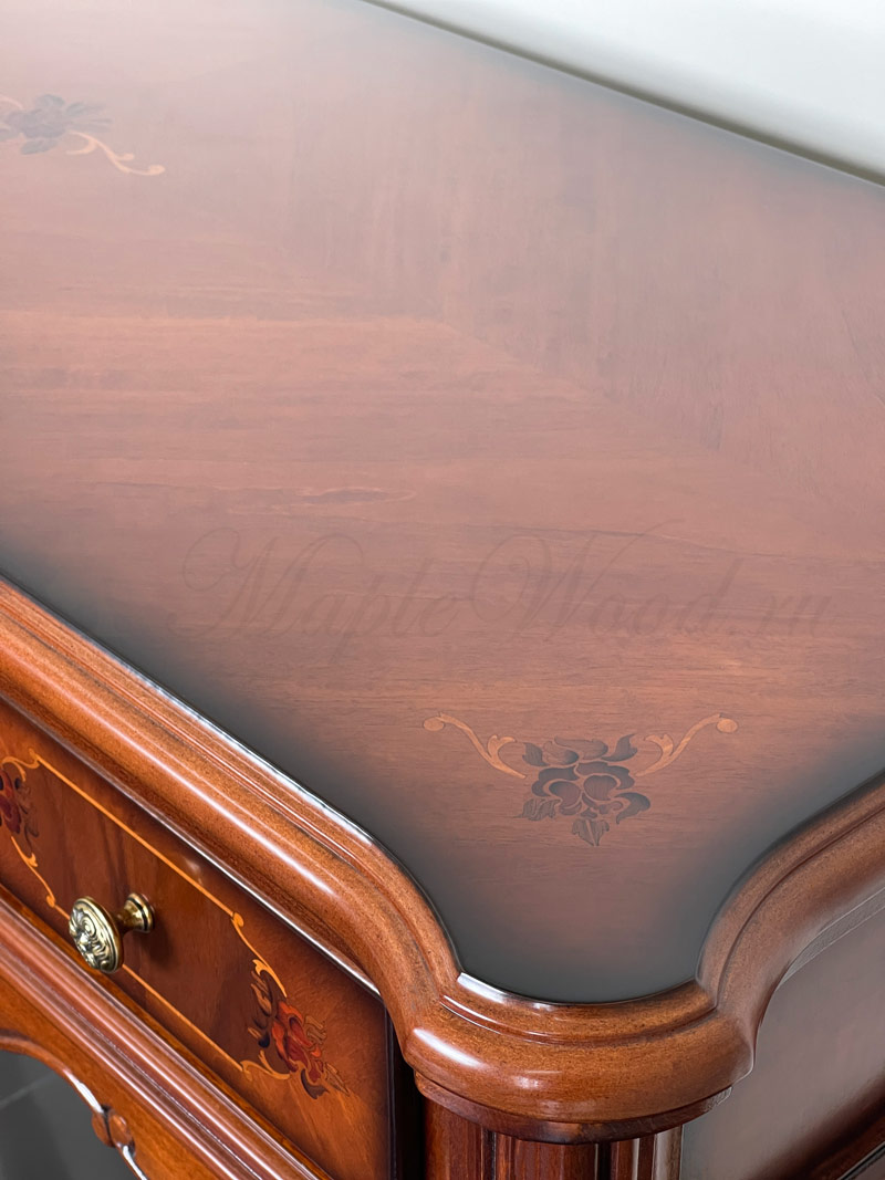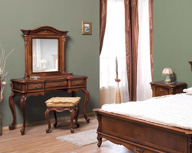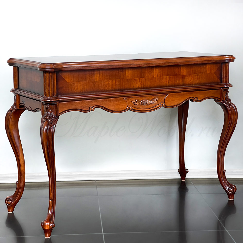 Туалетный стол на изогнутых ножках из коллекции Регаллис от фабрики Simex выполнен в классическом стиле из натурального дерева и декорирован искусной резьбой и инкрустацией из шпона.