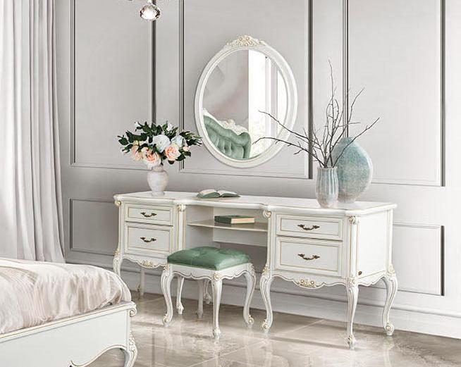 Туалетный стол на изогнутых ножках из коллекции Жасмина от фабрики Simex выполнен в классическом стиле в белом оттенке и декорирован золотой патиной, которая подчеркивает резные детали изделия.