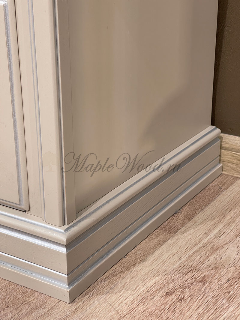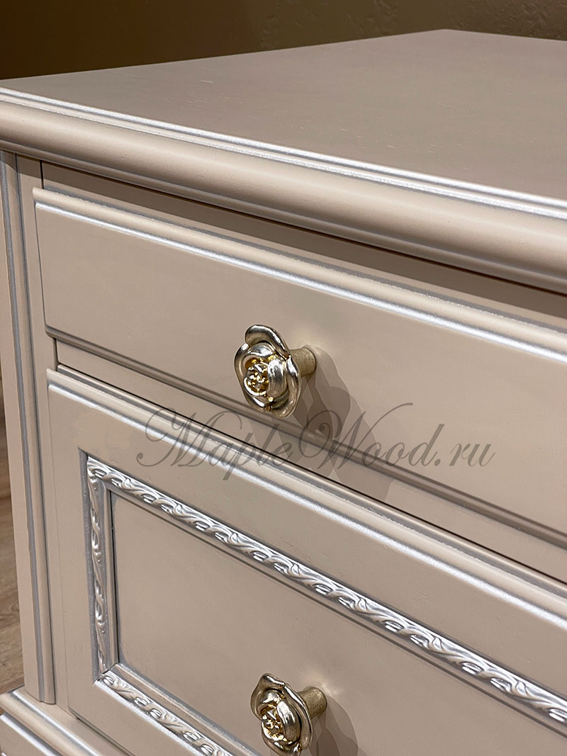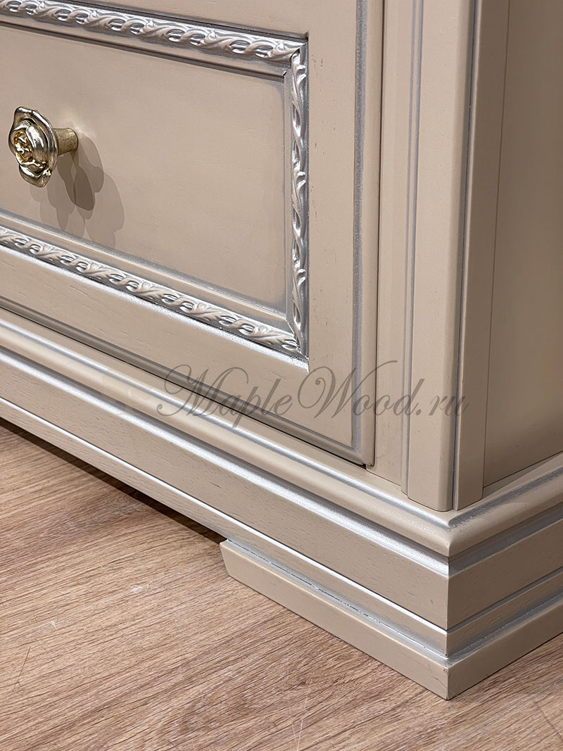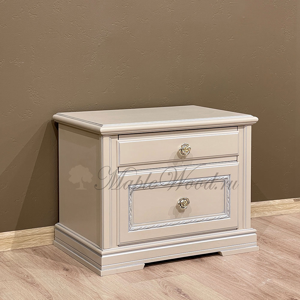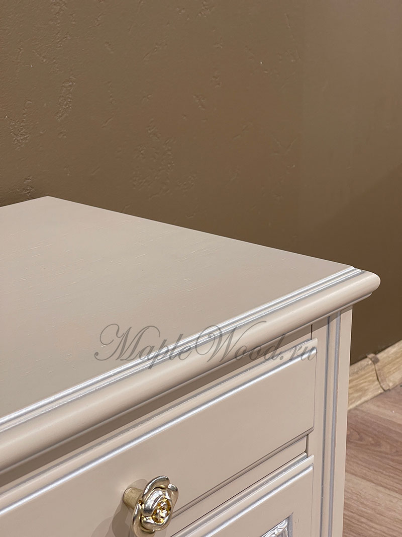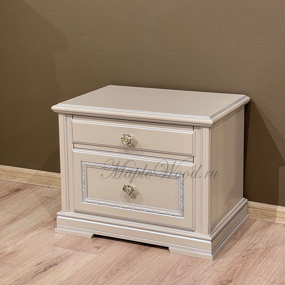 Прикроватная тумба из коллекции Палермо от фабрики Тимбер выполнена в классическом стиле из шпонированного МДФ с элементами из массива дерева и декорирована серебряной патиной, которая подчеркивает акцентные детали изделия.