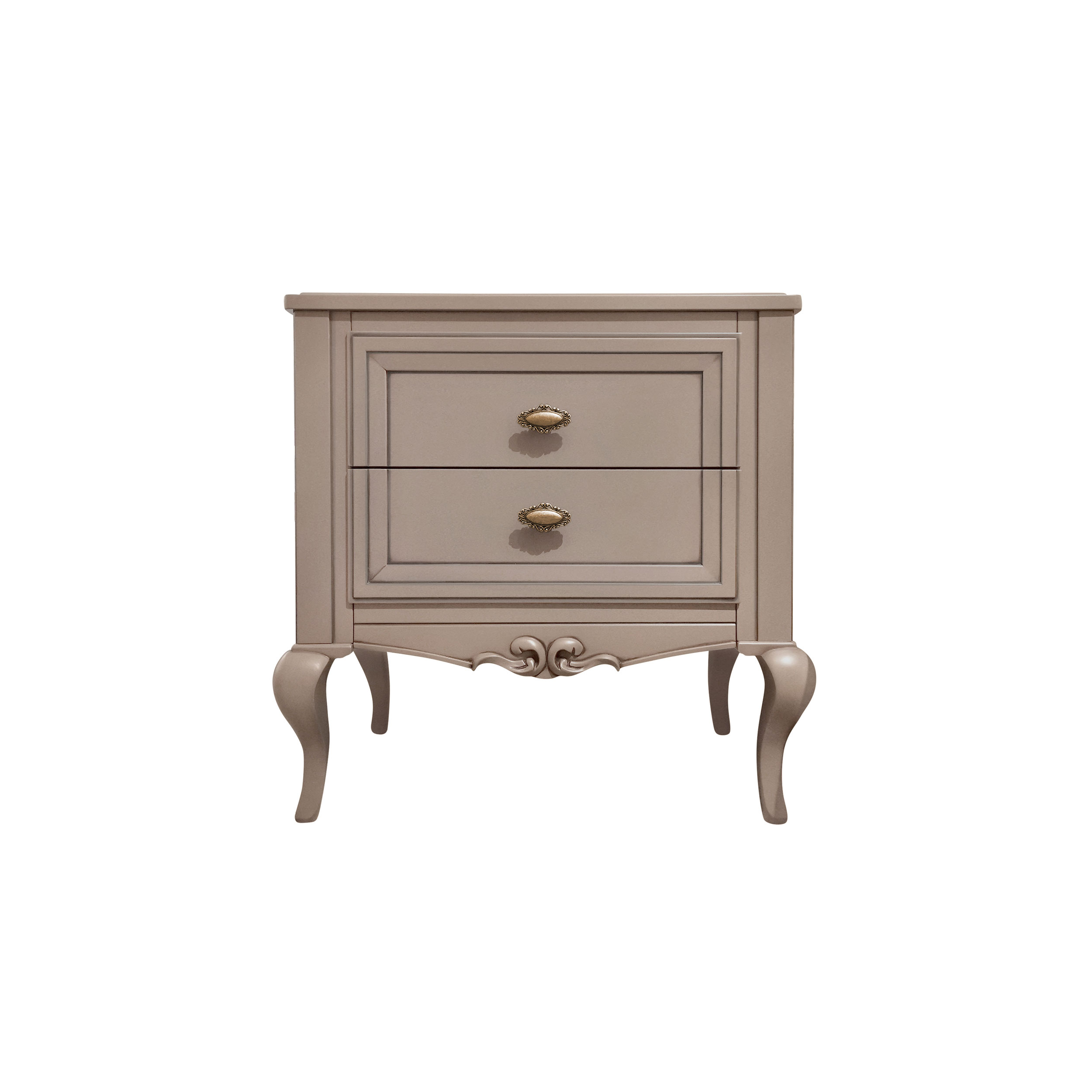 Прикроватная тумба на фигурных ножках из коллекции Портофино от фабрики Тимбер оборудована двумя выдвижными ящиками, которые оснащены системой плавного закрывания.
