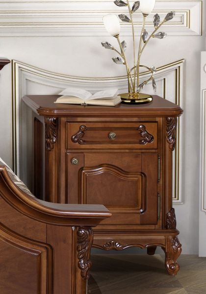 Прикроватная тумба из коллекции Роял от фабрики Simex изготавливается из массива и шпона древесины с использованием высококачественной отделки, которая позволяют изделию долгое время сохранять прочность и красоту.