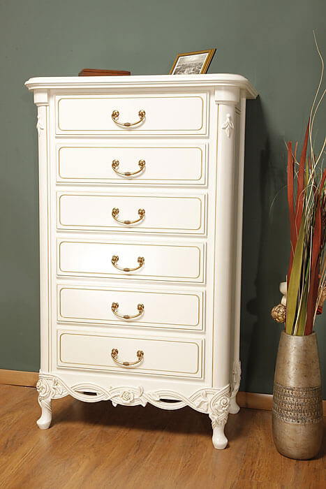 Высокий комод из коллекции Флора от фабрики Simex выполнен в классическом стиле из натурального массива дерева и декорирован золотой патиной и ажурной резьбой с цветочным мотивом.