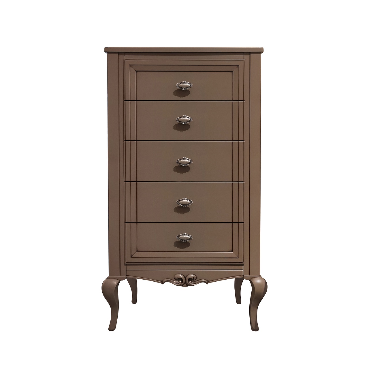 Высокий комод для белья и одежды из коллекции Портофино от фабрики Тимбер оборудован четырьмя вместительными ящиками, которые оснащены системой плавного закрывания.
